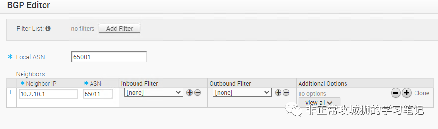 定义本地自治域AS,如65001;邻居的IP地址和AS,如采用eBGP方式与下游的NSX Tier0网关建立BGP邻居;