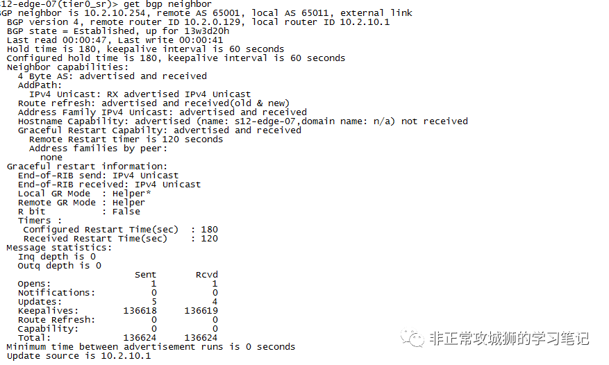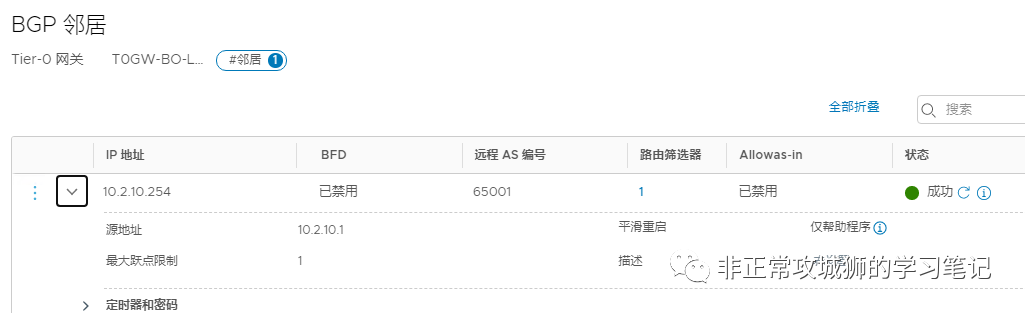 如下图,可以看到,在Tier0网关侧看到邻居已经建立【BGP state - Established】