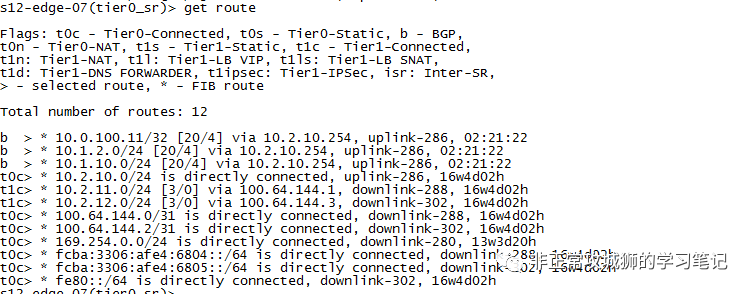 10.0.100.11/32,这是上联Edge设备的管理地址;10.1.2.0/24,这是HQ站点的ALB后端地址池网络,也就是之前我们定义的HQ站点的VLAN4009;10.1.10.0/24,这是HQ站点的Web前端应用网络,也就是之前我们定义的HQ站点的VLAN4000。这说明上游Edge设备已经通过SD-WAN的VeloCloud Gateway组件接收到了路由更新,学习到了HQ站点的网络信息,并且通过BGP协议,传递给了下游的Tier0网关设备。