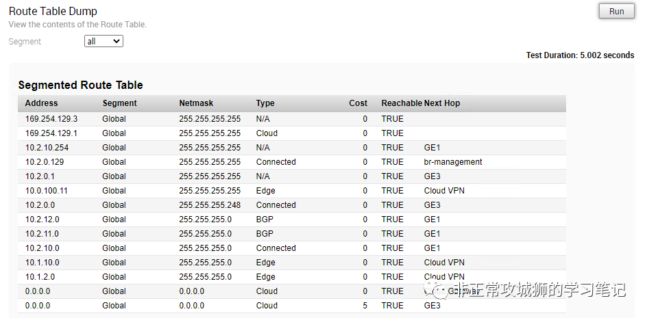 而查看BO站点Edge的路由表,可以相互印证这一点。如下图所示,Edge设备通过BGP路由协议学习到了10.2.11.0/24和10.2.12.0/24两个NSX DC网络的路由。