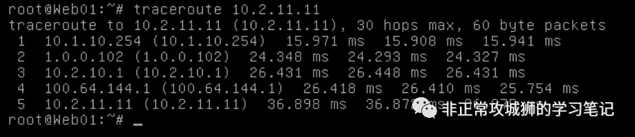 第四跳是100.64.144.1,这是BO站点Tier0网关的下联Tier1网关的内联地址,我们在NSX DC的连载中介绍过,Tier0与Tier1之间的级联将会由NSX-T Manager自动分配一个100.64.0.0/16的地址用于互联。最终在Tier1网关的路由下,到达了目标的App中间件网络10.2.11.0/24。
