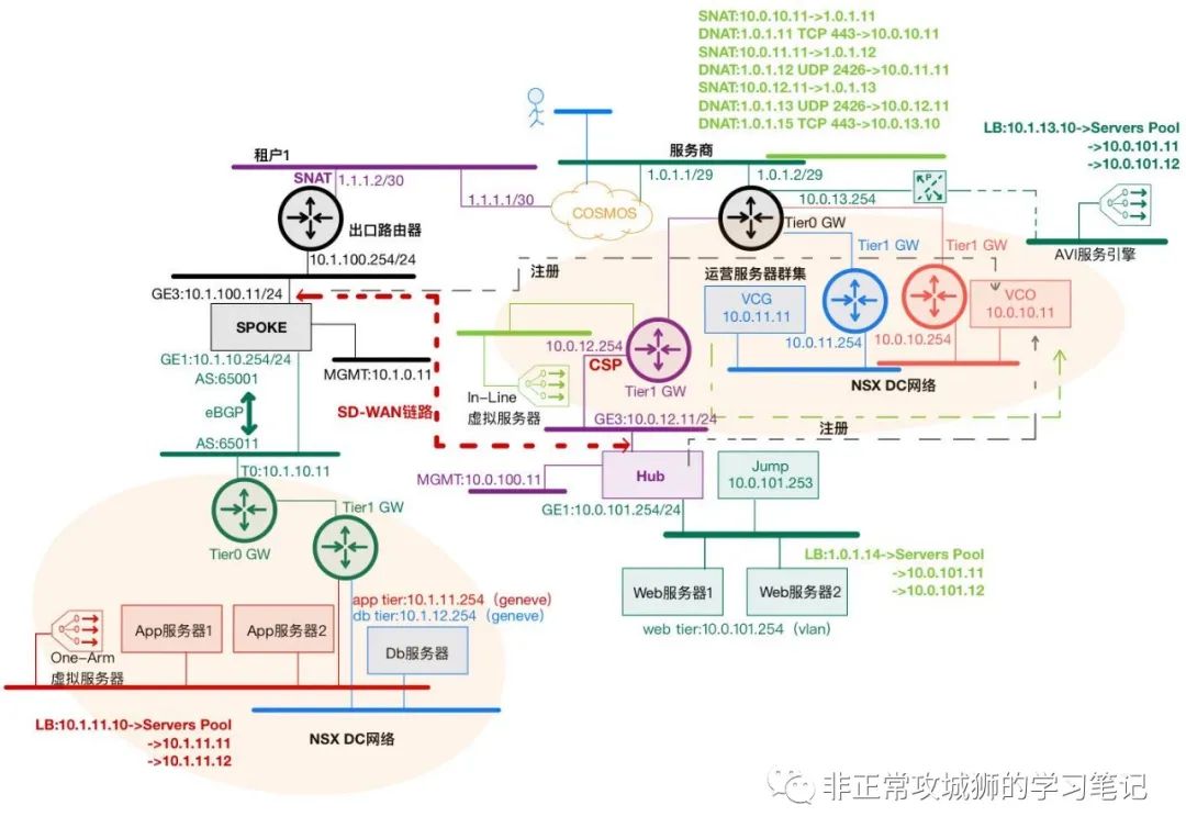 现在右侧HQ站点的NSX DC网络与左侧BO站点的NSX DC网络,已经通过SD-WAN链路实现了三层互通。Web服务器通过SD-WAN与中间件App服务器进行通信,而中间件App服务器通过NSX DC的软件定义网络与后端DB数据库服务器进行通信,形成了一个覆盖虚拟云网络的典型3-Tier应用模型。我们知道,NSX DC除了提供软件定义网络、分布式防火墙以外,也可以提供软件负载均衡器的功能。如下图所示,晓冬利用该特性,实现了App01和App02两台中间件的负载均衡。