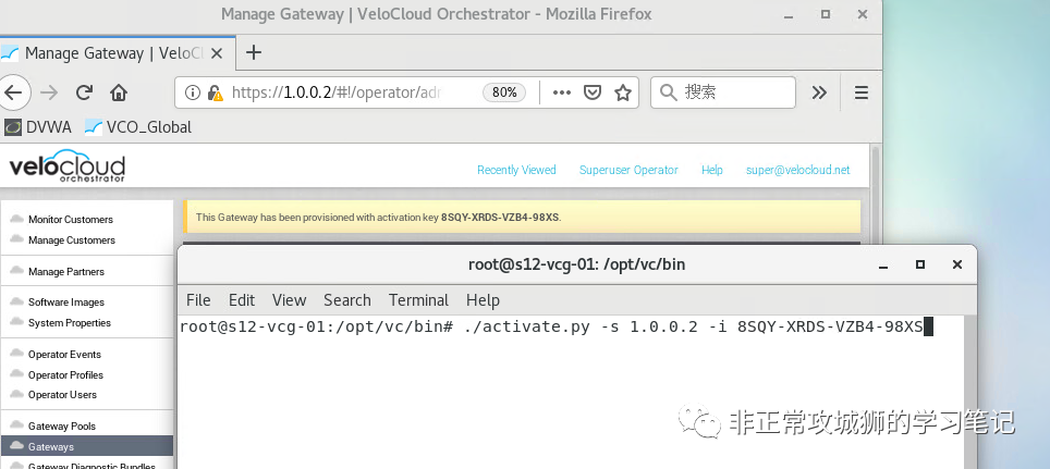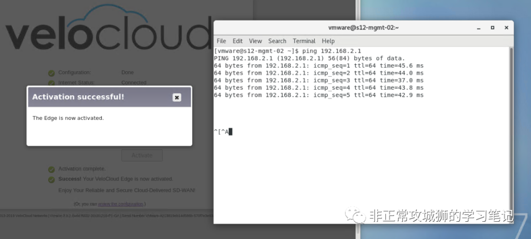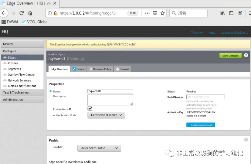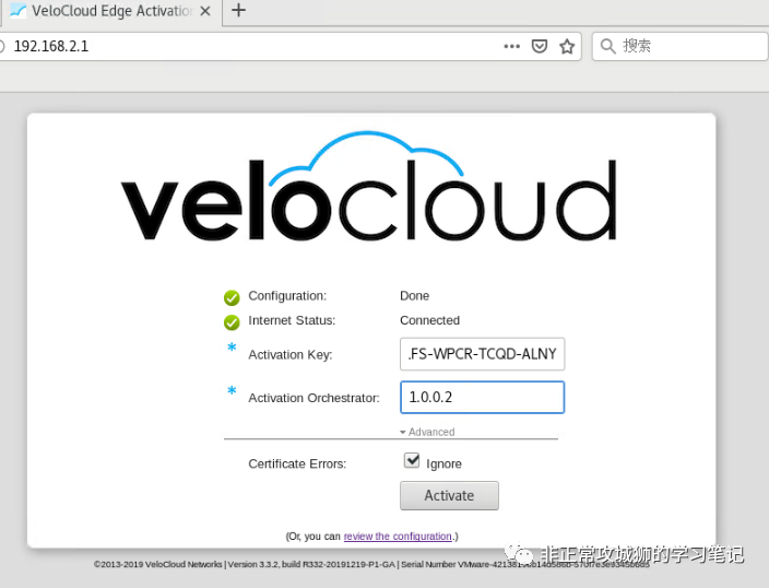 0x04.VCE激活与注册访问VCE的管理界面,输入激活码、VCO地址,并忽略证书错误(建议),然后点击Activate激活。等待数秒之后,VCE注册完成,此时该VCE的LAN口将根据Profile的定义,设置新的IP地址