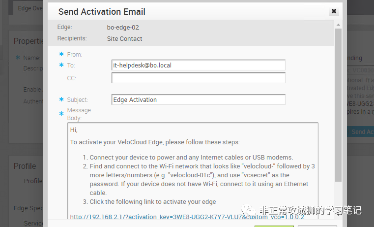 随后点击邮箱中的链接,就可以完成“零接触”部署,它的含义其实就是任意站点的用户,不需要进行任何的配置,在租户管理员创建Edge后,通过一个简单的邮件链接点击,就可以实现VCE的注册和SD-WAN的联网。