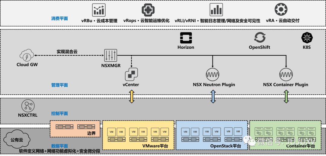 在经过一段时间对NSX DC产品的深入摸索后,我越来越感觉到,vSphere是一个相对“纵向”的产品,VMware的大部分产品都可以和vSphere实现集成,比如:vSAN、NSX、SRM、vRops等等,数不胜数;NSX是一个相对“横向”的产品,各类非VMware的异构化平台,都可以和NSX DC实现集成,比如:利用Neutron Plugin实现与Openstack平台集成提供网络与安全解决方案;利用Container Plugin实现与K8S、Openshift等容器平台的云原生网络与安全等。凭借vSphere和NSX DC,VMware可以将整个数据中心内的方方面面都联系起来,共同打造一个软件定义的数据中心架构。用一句流行的话来描述笔者的心情,真是“想想都觉得兴奋”。