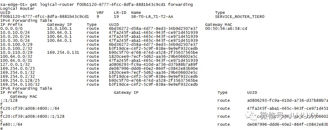 查看sa-edge-01中的Tier-0 SR路由表,可以看到其中有一条0.0.0.0/0 NH=10.0.100.1的路由