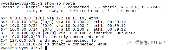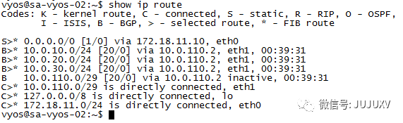 在上联10.0.110.1(sa-vyos-02路由器)查看路由表: