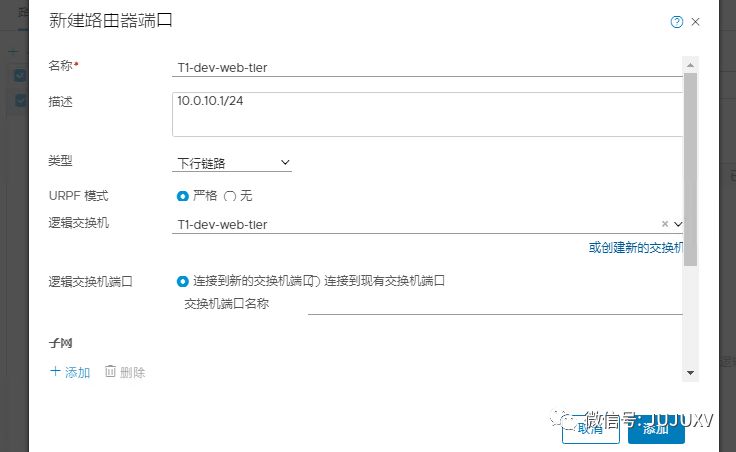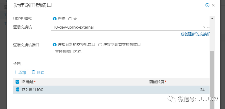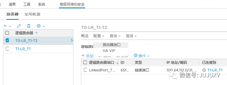 选择T0-LR_T1-T2逻辑路由器,选择配置-路由器端口,添加一个上联到物理VLAN网络的接口