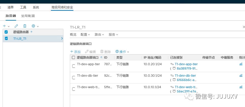 但是在多租户场景中,由于逻辑网络拓扑高复杂度和可能存在的网络地址段重叠,建议采用T0和T1两个分级,现在我先演示如何部署T1DR角色,率先实现Web、App、DB三个逻辑网络的三层路由。