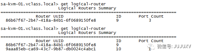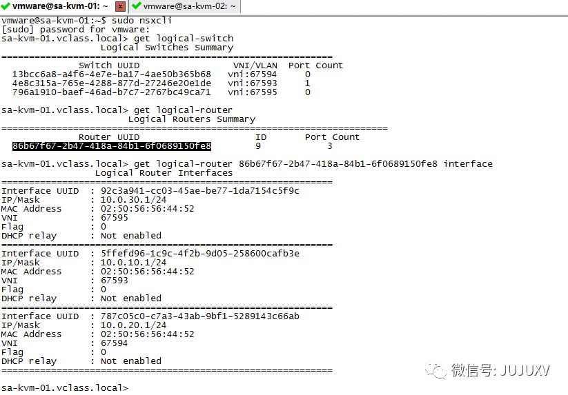 此时访问主机节点命令行,对于有虚拟机承载的Hypervisor主机,无论是KVM和vSphere,都可以看到三个逻辑交换机和一个逻辑路由器,并且逻辑路由器的角色是T1DR