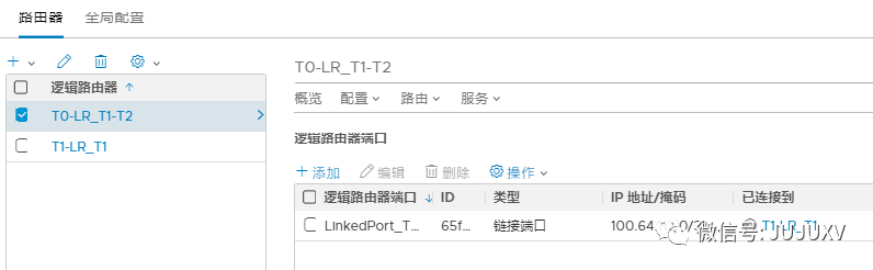 对于T1LR而言,多了一个自动创建的逻辑网络,并且自动设置了一个100.64.0.0/24的网络地址;这一点与NSX-V的配置略有不同,在NSX-V架构下,管理员需要手动配置一个Transit逻辑交换机,用于连接DLR和ESG(相当于DR和SR连接)