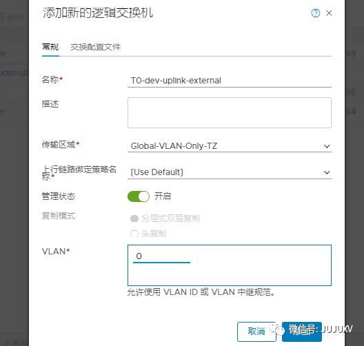 在配置T0LR的上联VLAN物理网络之前之前,需要创建一个用于VLAN上联的逻辑交换机,命名为T0-dev-uplink-external,VLAN为0
