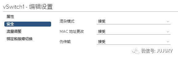 虚拟机Edge流量还要经过ESXI主机的虚拟交换机,因此必须开启虚拟交换机的“伪传输"