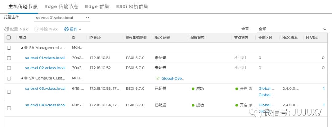 等待Edge节点部署完成,并确认配置状态和节点状态均为开启,传输区域关联正确,N-VDS创建正确