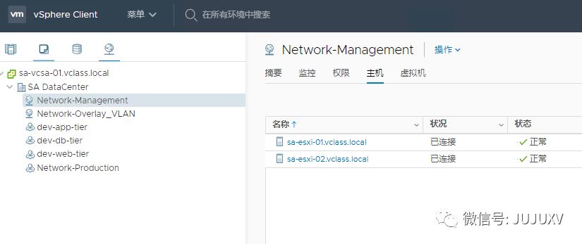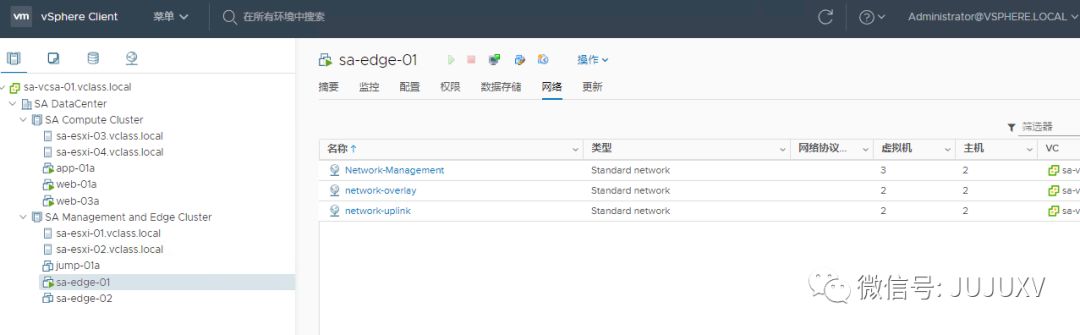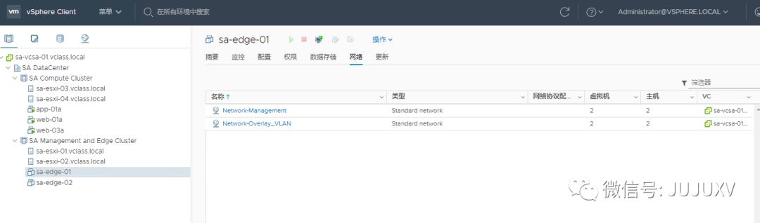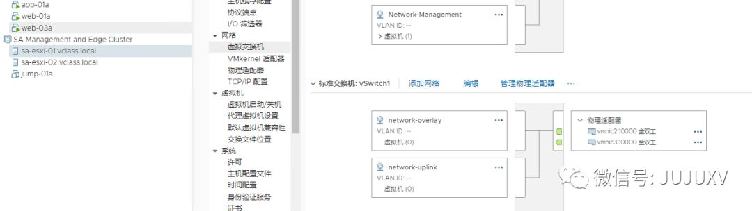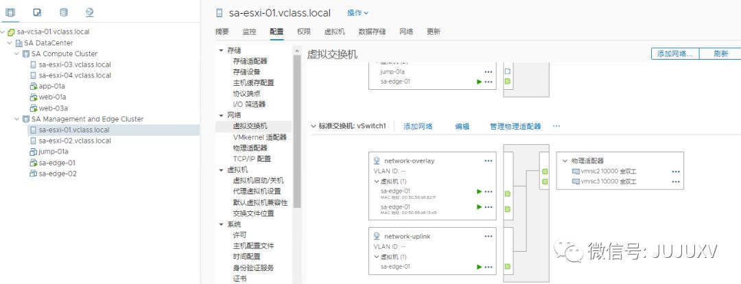访问vCenter,可以看到该Edge虚拟机连接到了三个不同的虚拟网络,其中Network-Management是ESXi的虚拟机端口组,network-overlay和network-uplink是NSXMGR创建的N-VDS上的逻辑交换机