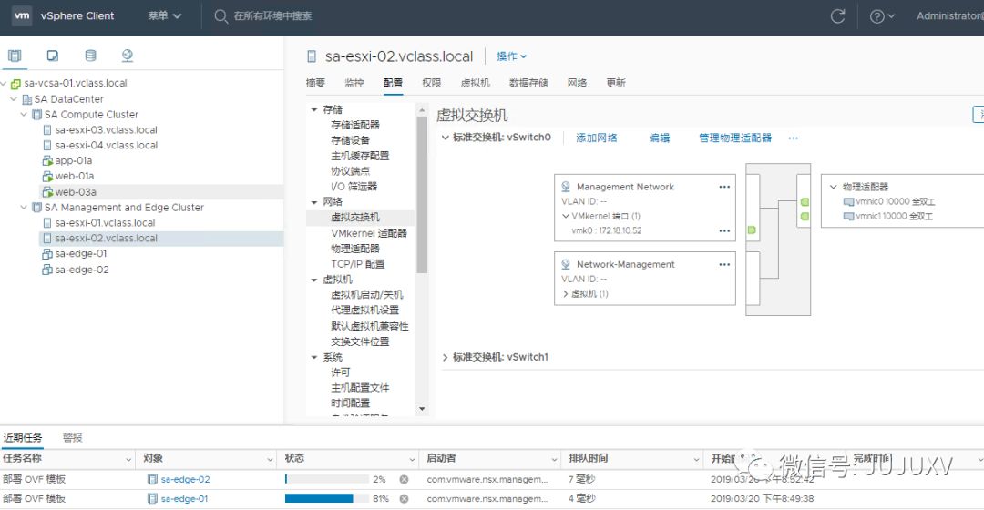 如果访问VC界面,可以看到NSXMGR正在导入OVF,进行Edge虚拟机的部署