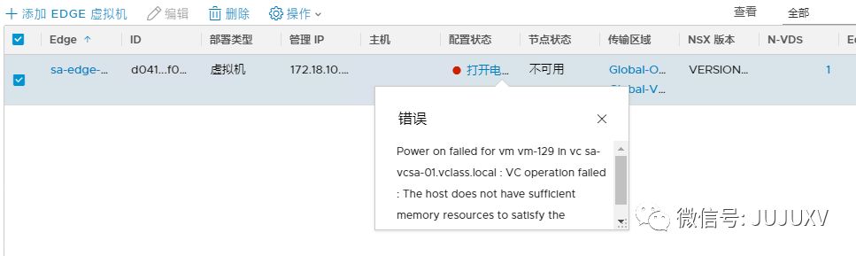 注:Edge虚拟机会完全预留内存,因此必须保证ESXi主机有足够的内存,否则会出现无法开启虚拟机电源状态,无法完成NSX配置并注册到NSXMGR的情况