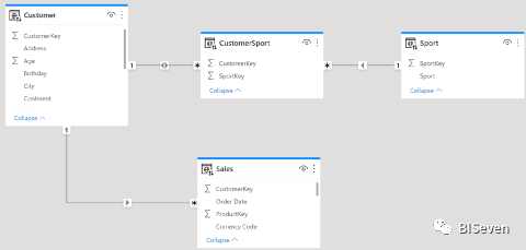 第二个模型在视觉上更吸引人,它没有双向关系——这是最重要的。来自Customer或Sport的Filter首先应用于CustomerSport,然后通过多对多交叉过滤器关系传递到Sales。