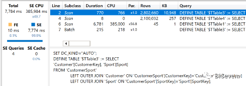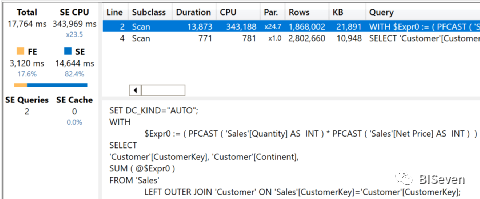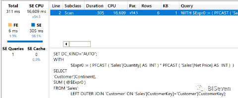 不涉及公式引擎,并行度是令人敬畏的x54.5,整个查询只使用16609毫秒的存储引擎CPU执行。这是可以预期的具有常规一对多关系的DAX的行为。整个计算是由它最好的引擎完成的:存储引擎。
