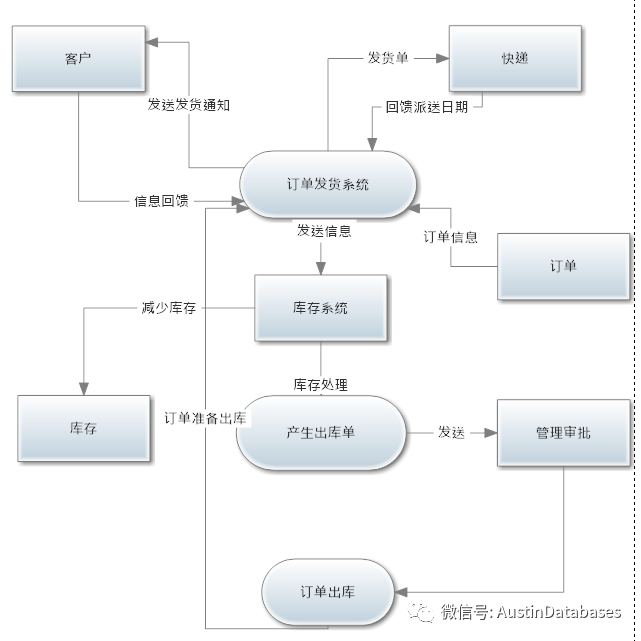 从下图我们可以知道,发货系统的数据源来自于订单,实体有客户,快递公司,仓库,审批管理人, 而数据的存储位置有 库存,订单,涉及两个系统处理过程,订单发货处理过程,与订单出库单生成过程