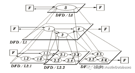 实际上DFD图,是一个简单到复杂的过程将数据流,数据流转分层的进行分析绘制,将某个软件开发中的东西细化的过程。下面就是DFD的分层图
