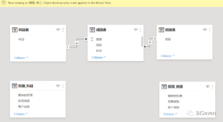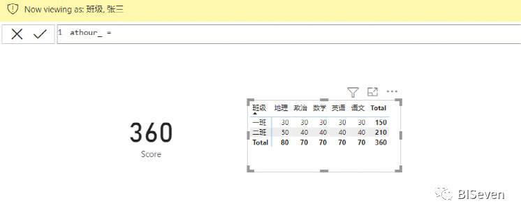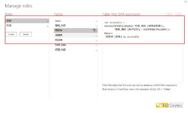 // 筛选班级表:var accessCls =CALCULATETABLE(VALUES('权限_班级'[拥有的权限]),'权限_班级'[账户名称] = USERPRINCIPALNAME())Return'班级表'[班级] in accessCls// 筛选科目表:var accessCls =CALCULATETABLE(VALUES('权限_科目'[拥有的权限]),'权限_科目'[账户名称] = USERPRINCIPALNAME())Return'科目表'[科目] in accessCls