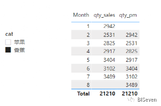 在下面的表格中,我们可以看到苹果每个月的售卖的数量及上个月售卖的数量