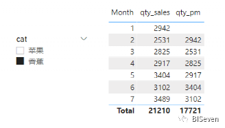 当打开双向关系后,应用在销售表上的的任何筛选器都会传递到日期表中,苹果在8月份并没有销量产生,所以销量表中并没有8月份,那么通过双向关系筛选日期表后并不包含8月份,那么时间智能函数也不会返回8月份,最后导致缺少了8月份的数据,这显然不是我们想要看到的结果。