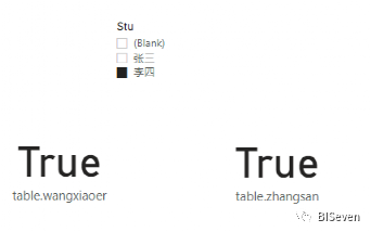 当我们在页面上加入筛选器并选择李四时,上述两段代码的结果都变为True,表明在当前上下文中,成绩表中没有张三和王小二的成绩