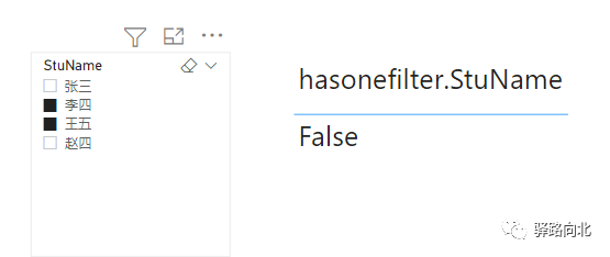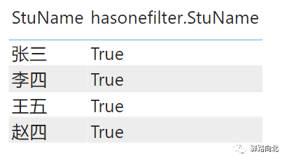 建立如下度量值hasonefilter.StuName,StuName来自学生表,结果表中的行标签也是来自学生表中的StuName,对于每一行来说,StuName都是被直接筛选至剩一个非重复值,所以度量值hasonefilter.StuName 在每一行中都是True