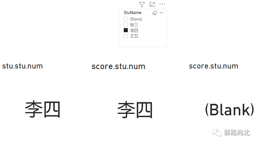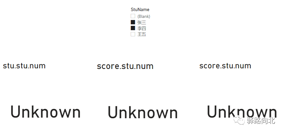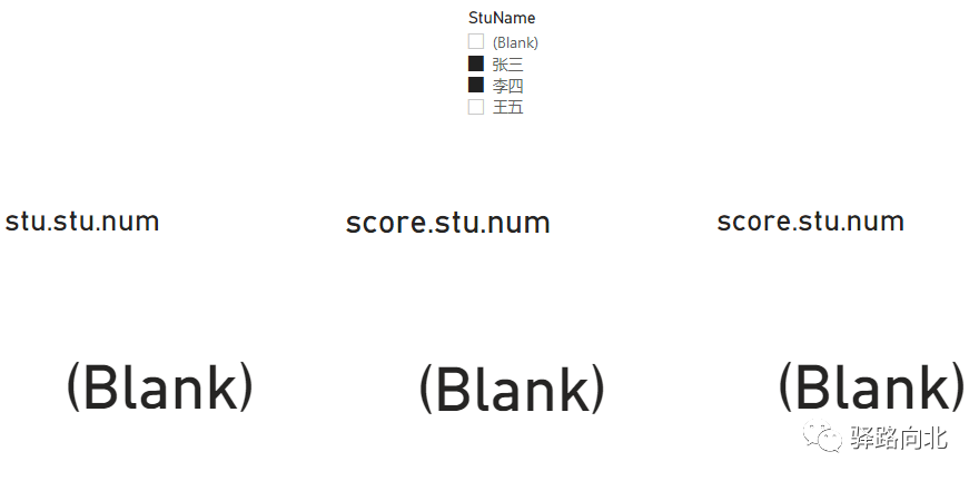 因为只有在Student表中才有”王五“,所以只有stu.stu.num 返回值为”王五“,其他两个度量值返回blank()