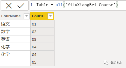Table =all('YiLuXiangBei Course'[CourID], 'YiLuXiangBei Course'[CourName])
