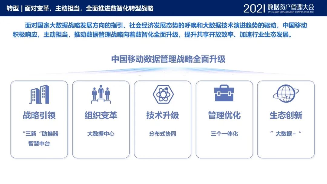 陶涛表示,数字经济时代,数字生产力逐渐成为企业转型的核心引擎,中国移动积极应对数据管理新要求,以“数治”夯实数据能力基础,以“数智”赋能内外部生态,坚定不移的推进数据治理能力在全网全域及跨行业的广覆盖、深融合,从数据组织的专业化、数据治理制度的体系化、大数据专家培养、分布式协同架构转型和三个“一体化”管理实践等方面全面推进数据治理能力升级,充分融合数据和技术要素,持续提升大数据产业供给能力。