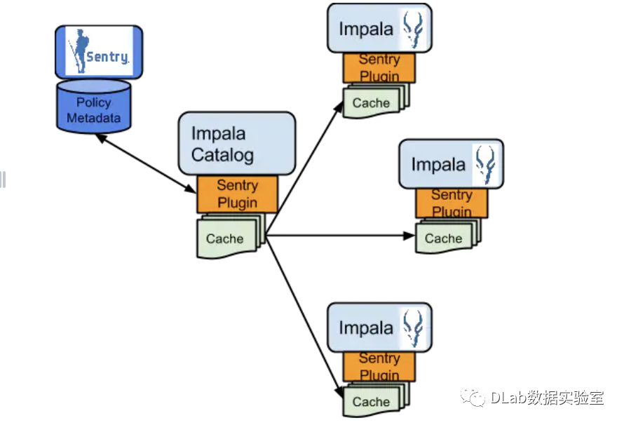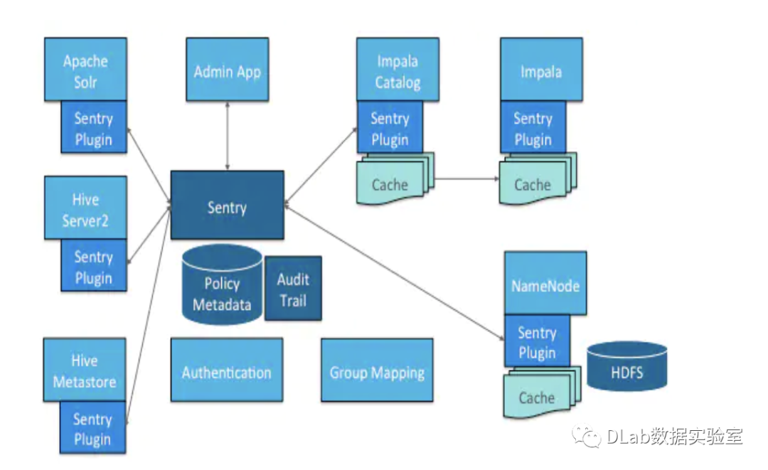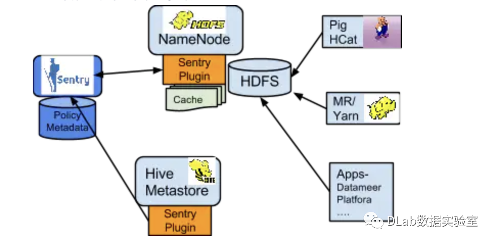 Sentry Plugin: Sentry Plugin运行在数据引擎中,它提供了操作存储在Sentry Server中的授权元数据的接口,还提供了(能从Sentry Server获取授权访问元数据信息来评估访问请求的)授权策略引擎。