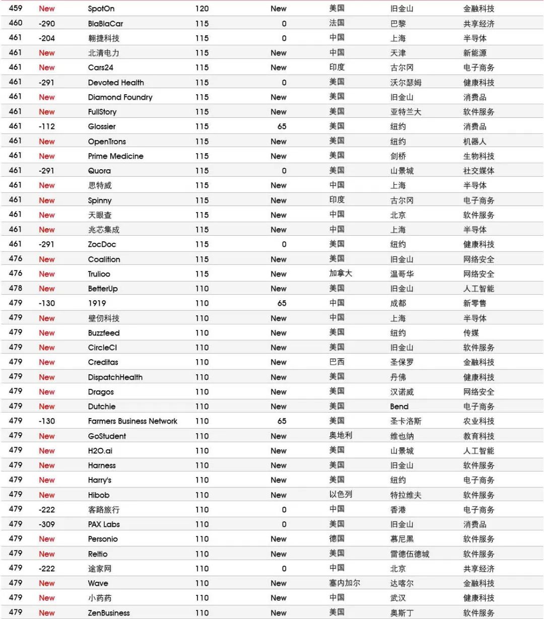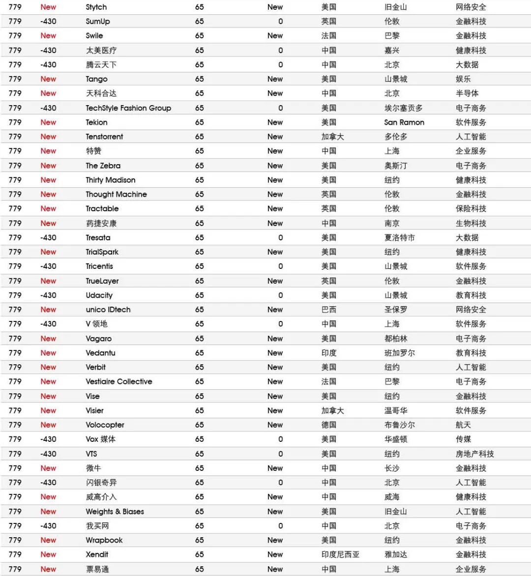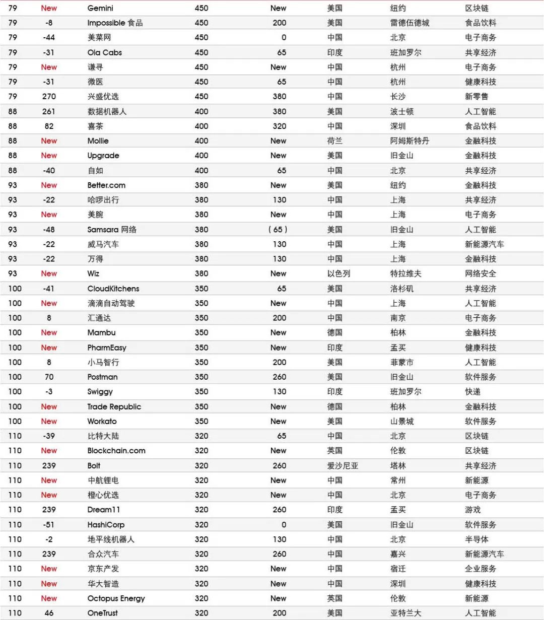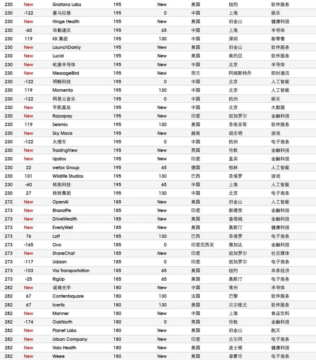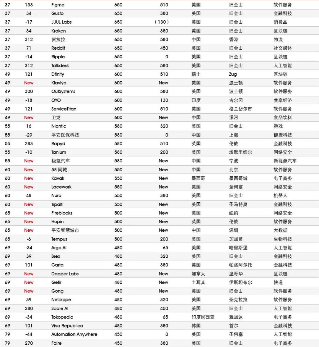 5家新进前十:总部斯德哥尔摩的支付平台Klarna、悉尼的在线设计平台Canva、旧金山的人工智能数据公司Databricks、旧金山的杂货配送平台Instacart和伦敦的数字银行Revolut。去年位列前十的滴滴、陆金所、爱彼迎、快手和Palantir因上市而退出榜单。