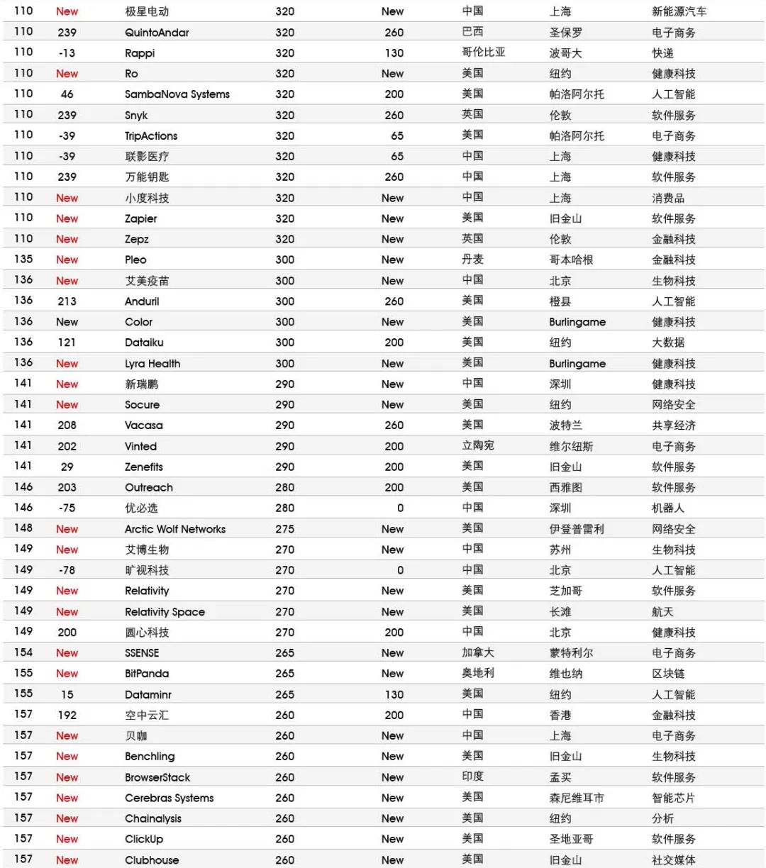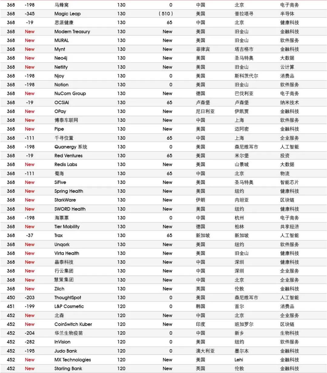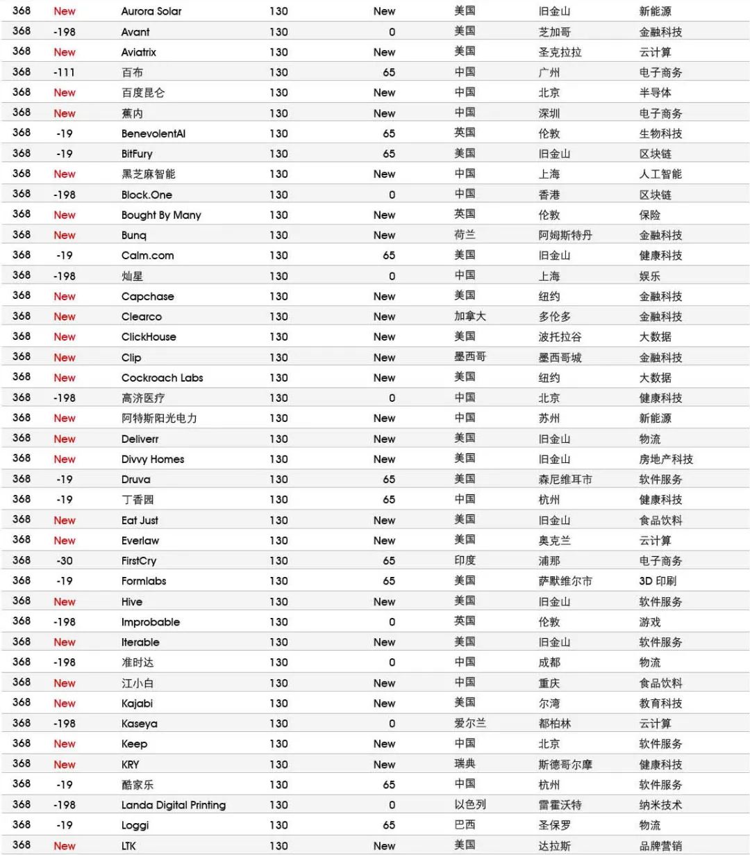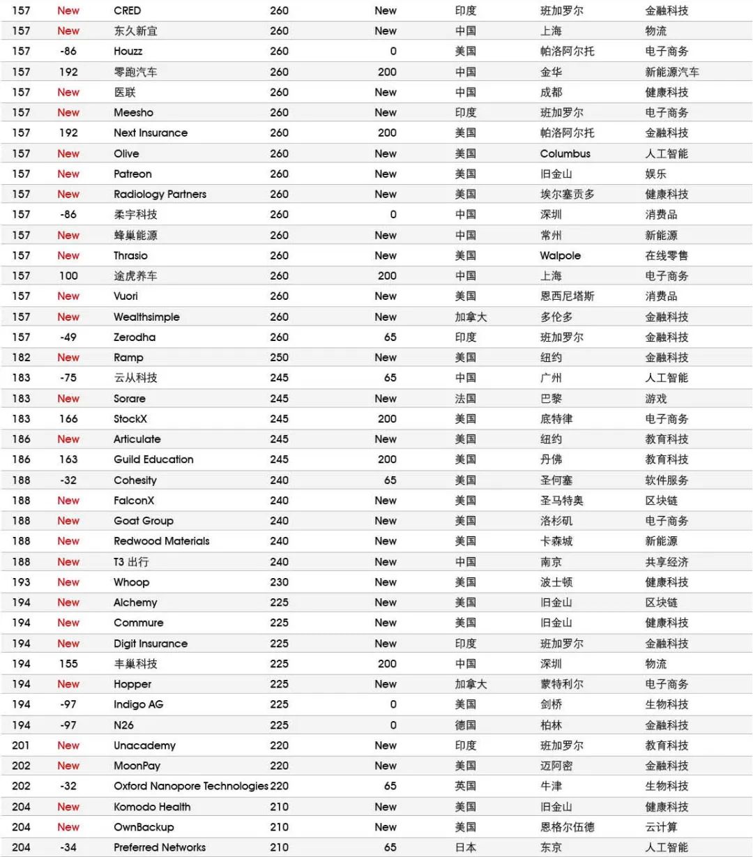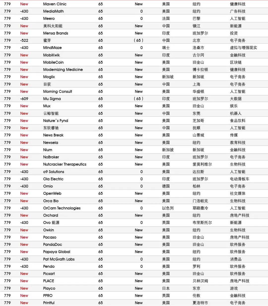 5家新进前十:总部斯德哥尔摩的支付平台Klarna、悉尼的在线设计平台Canva、旧金山的人工智能数据公司Databricks、旧金山的杂货配送平台Instacart和伦敦的数字银行Revolut。去年位列前十的滴滴、陆金所、爱彼迎、快手和Palantir因上市而退出榜单。