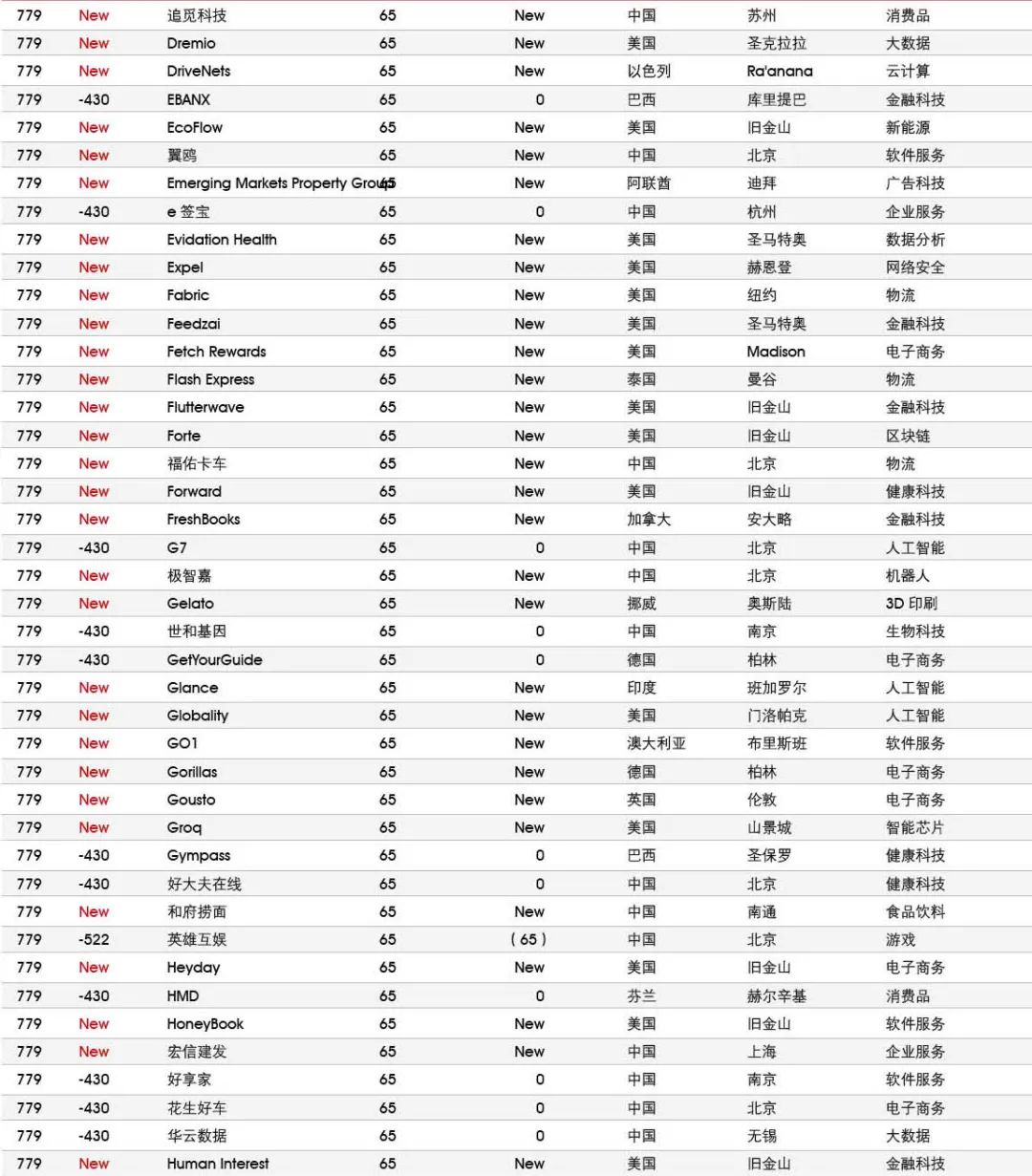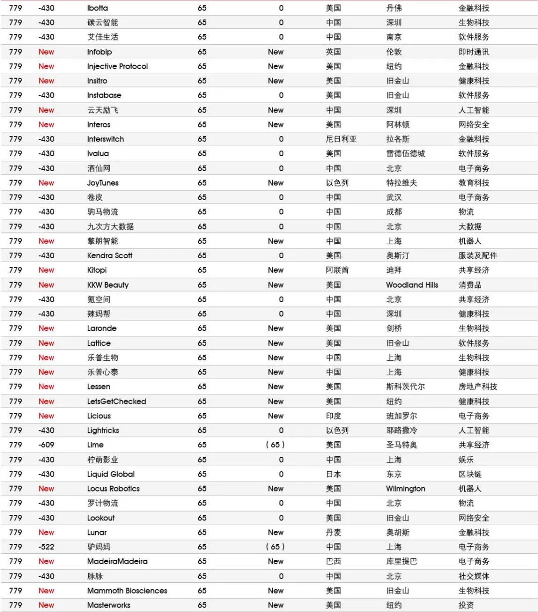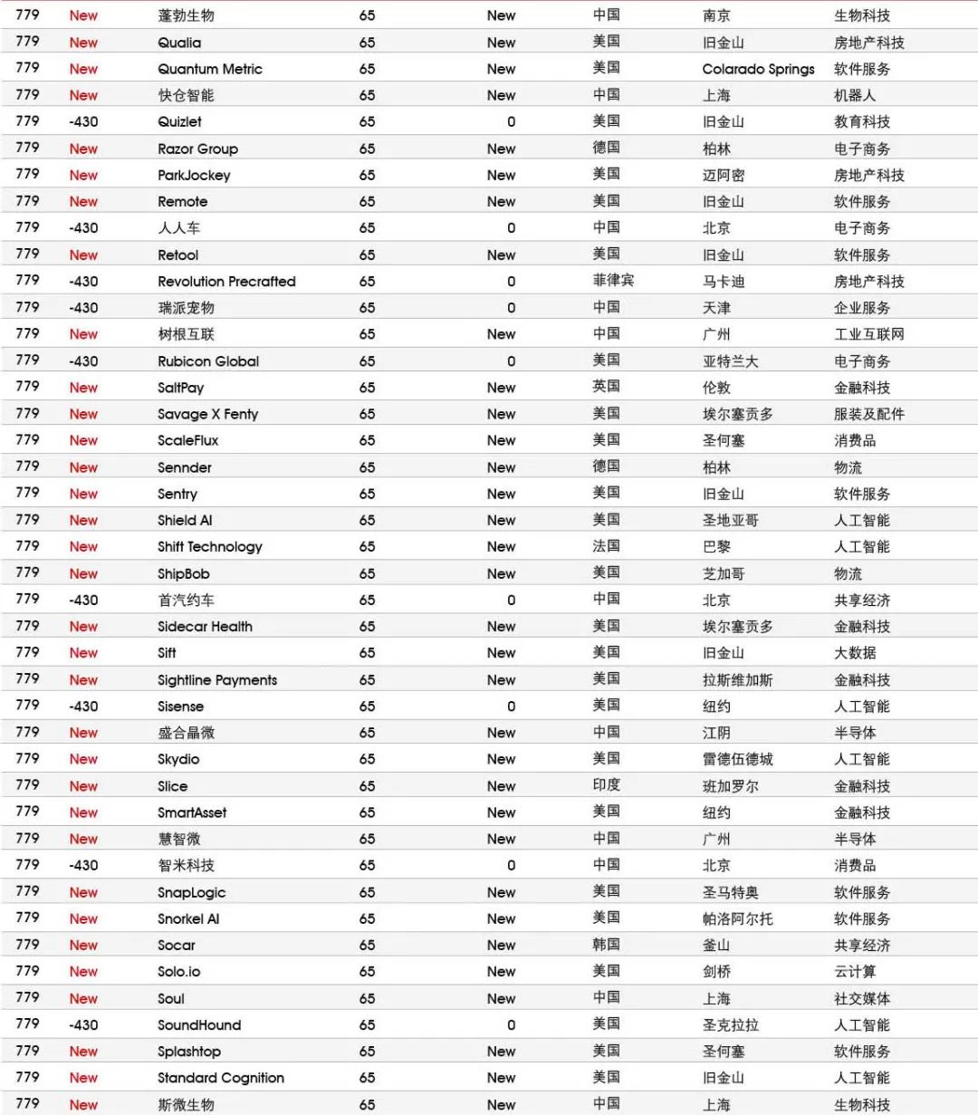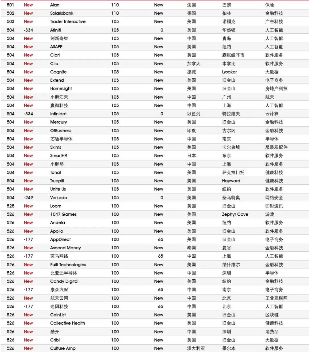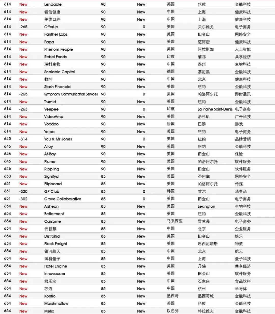 5家新进前十:总部斯德哥尔摩的支付平台Klarna、悉尼的在线设计平台Canva、旧金山的人工智能数据公司Databricks、旧金山的杂货配送平台Instacart和伦敦的数字银行Revolut。去年位列前十的滴滴、陆金所、爱彼迎、快手和Palantir因上市而退出榜单。