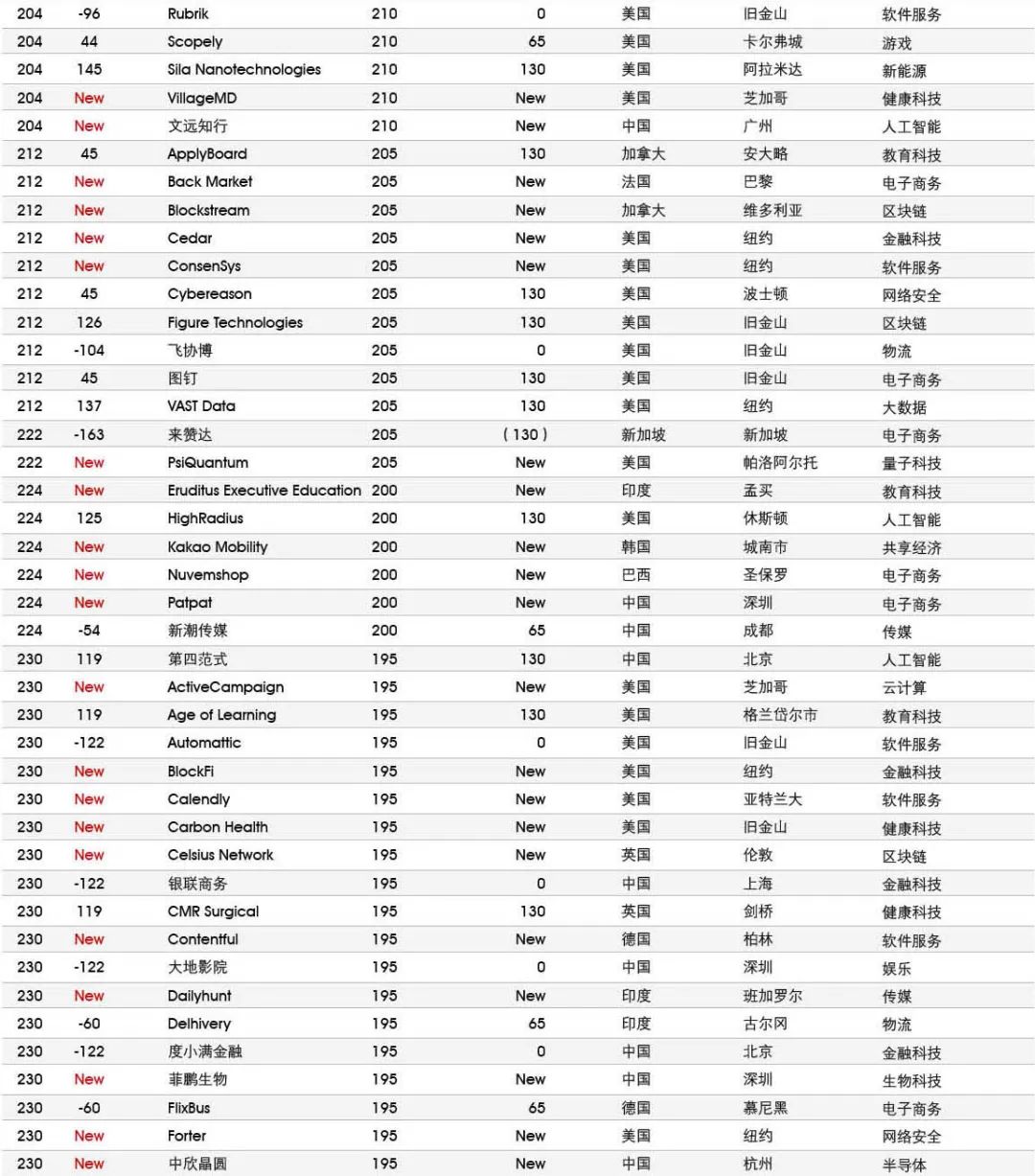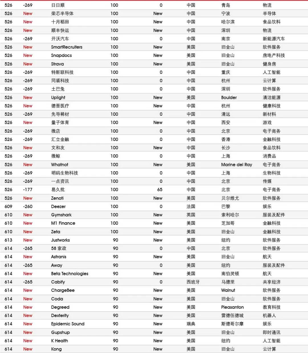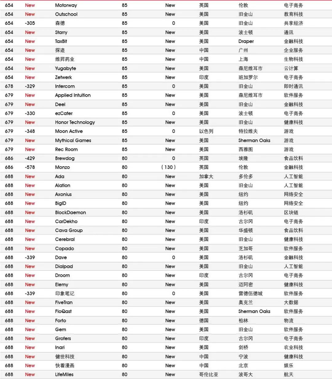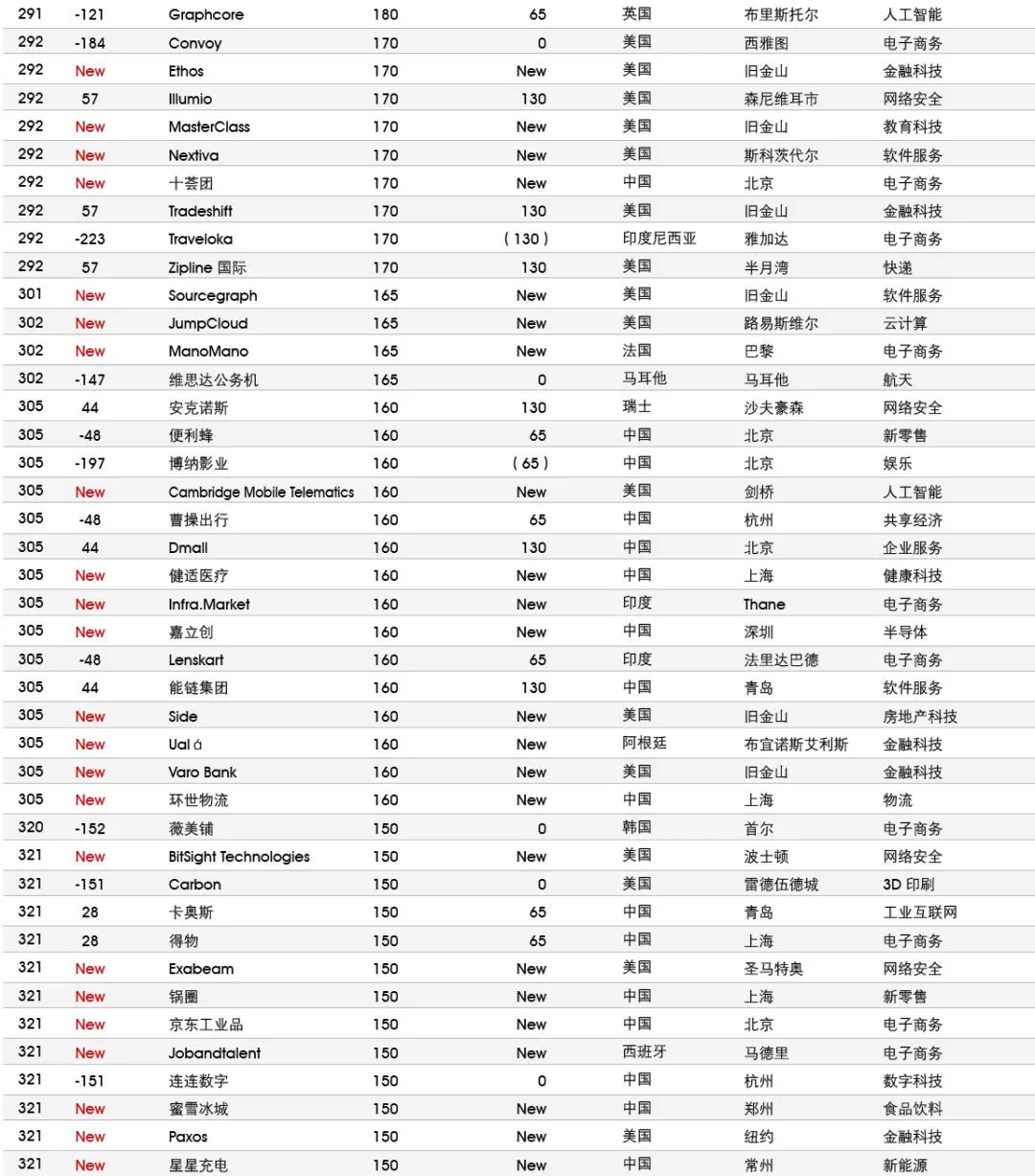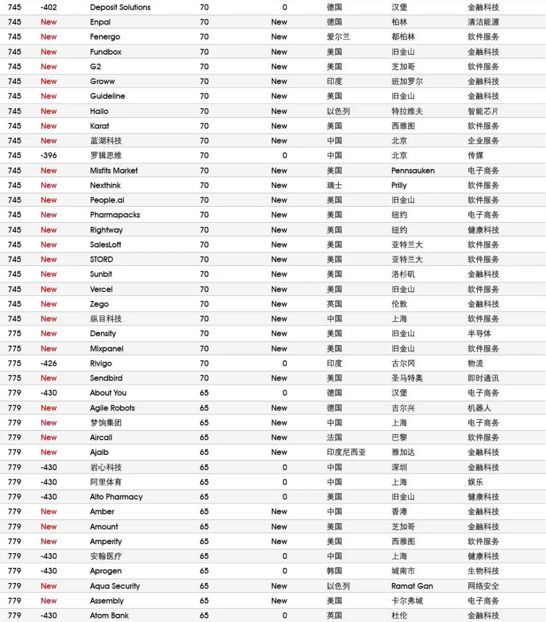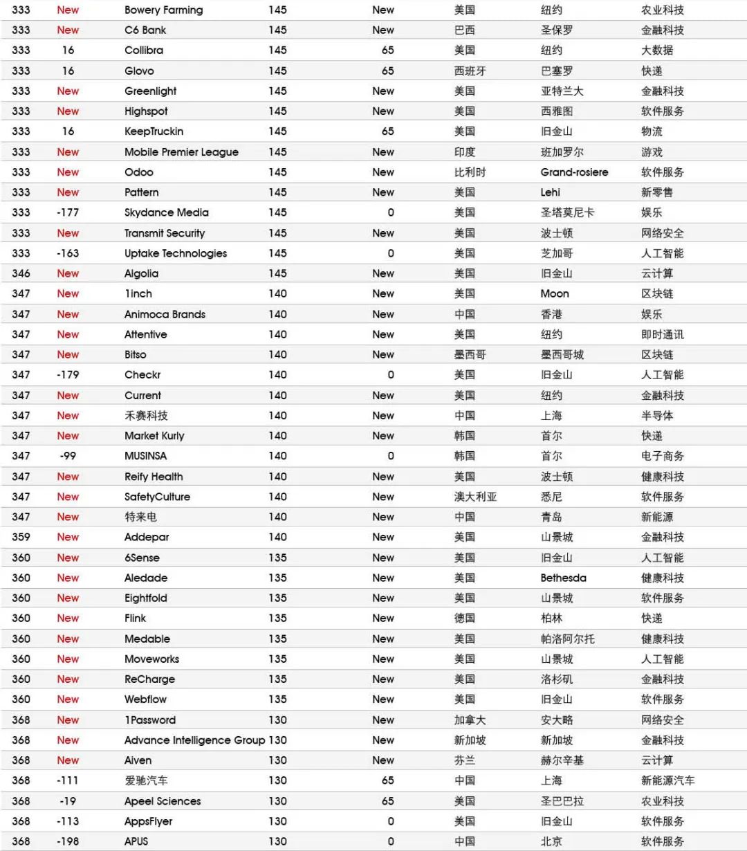 5家新进前十:总部斯德哥尔摩的支付平台Klarna、悉尼的在线设计平台Canva、旧金山的人工智能数据公司Databricks、旧金山的杂货配送平台Instacart和伦敦的数字银行Revolut。去年位列前十的滴滴、陆金所、爱彼迎、快手和Palantir因上市而退出榜单。