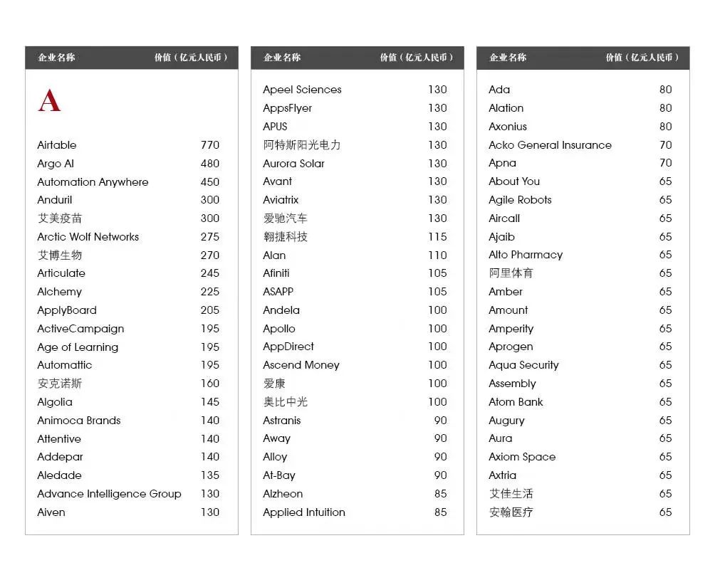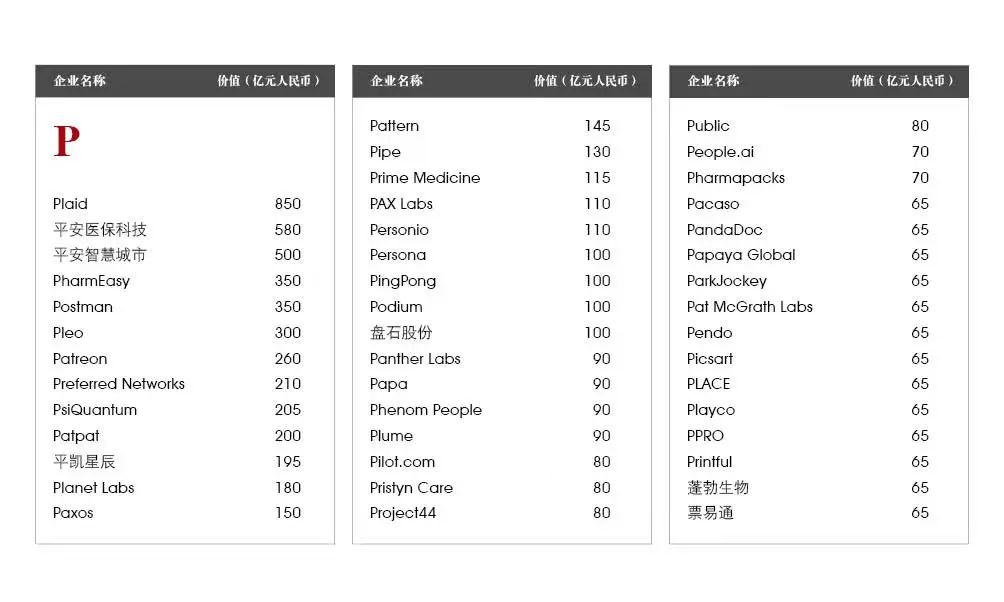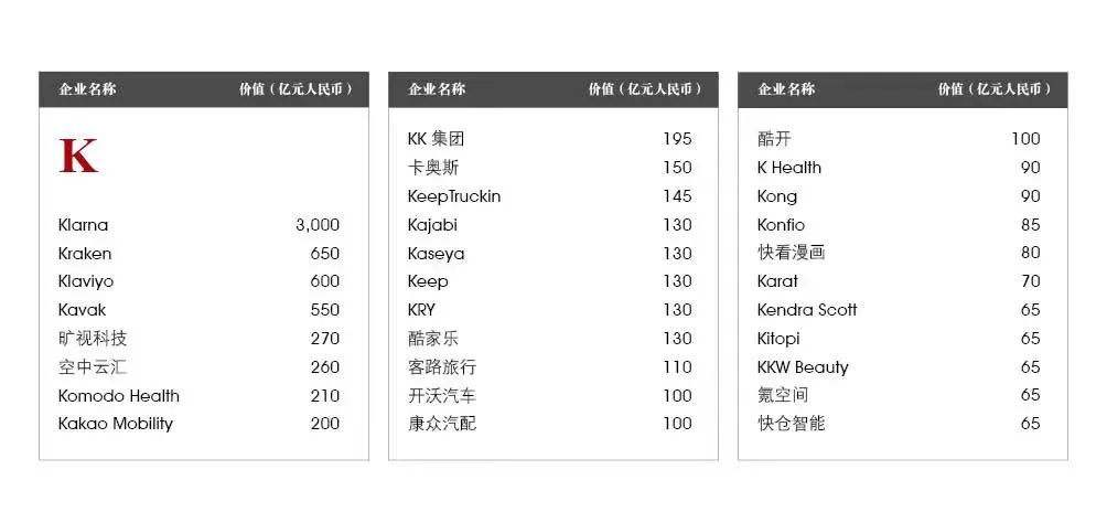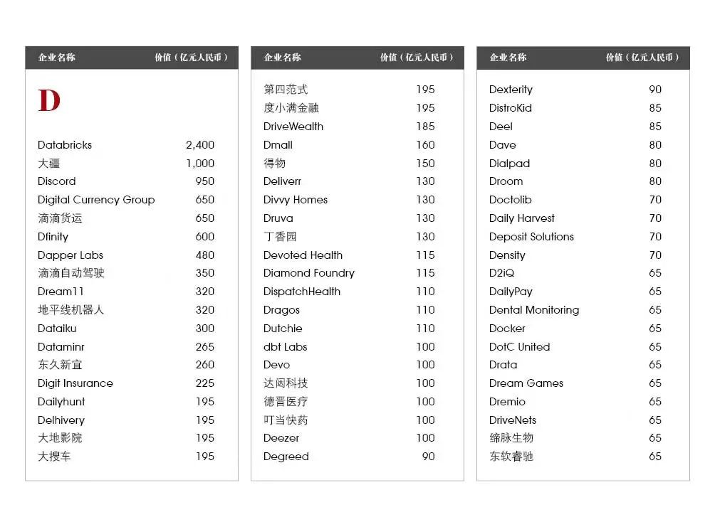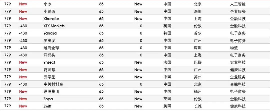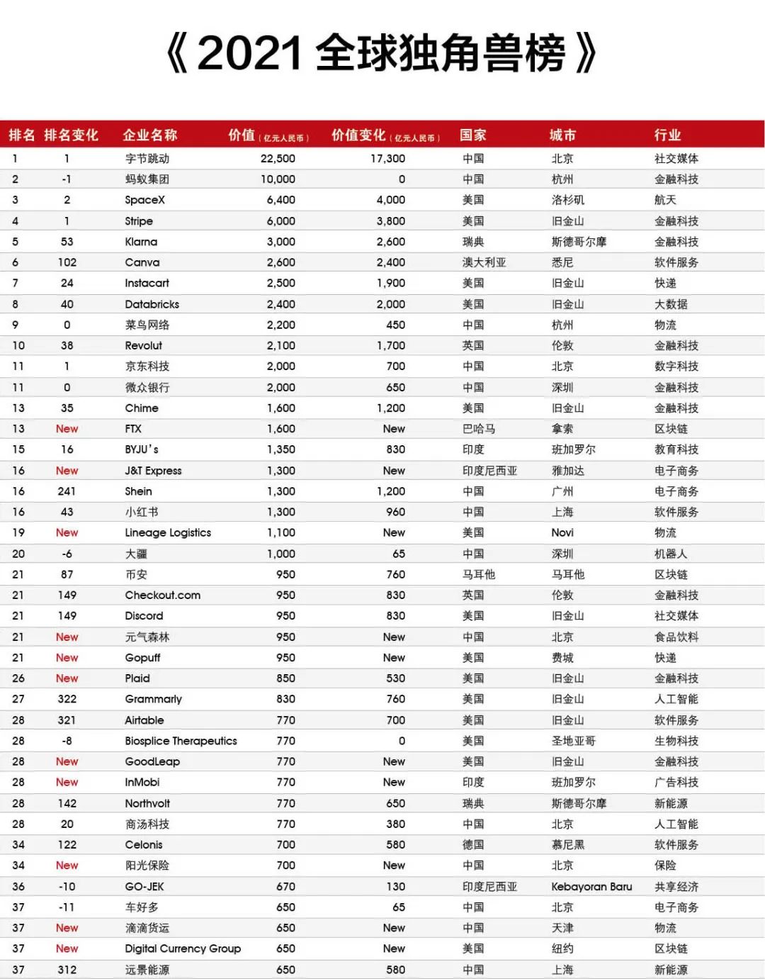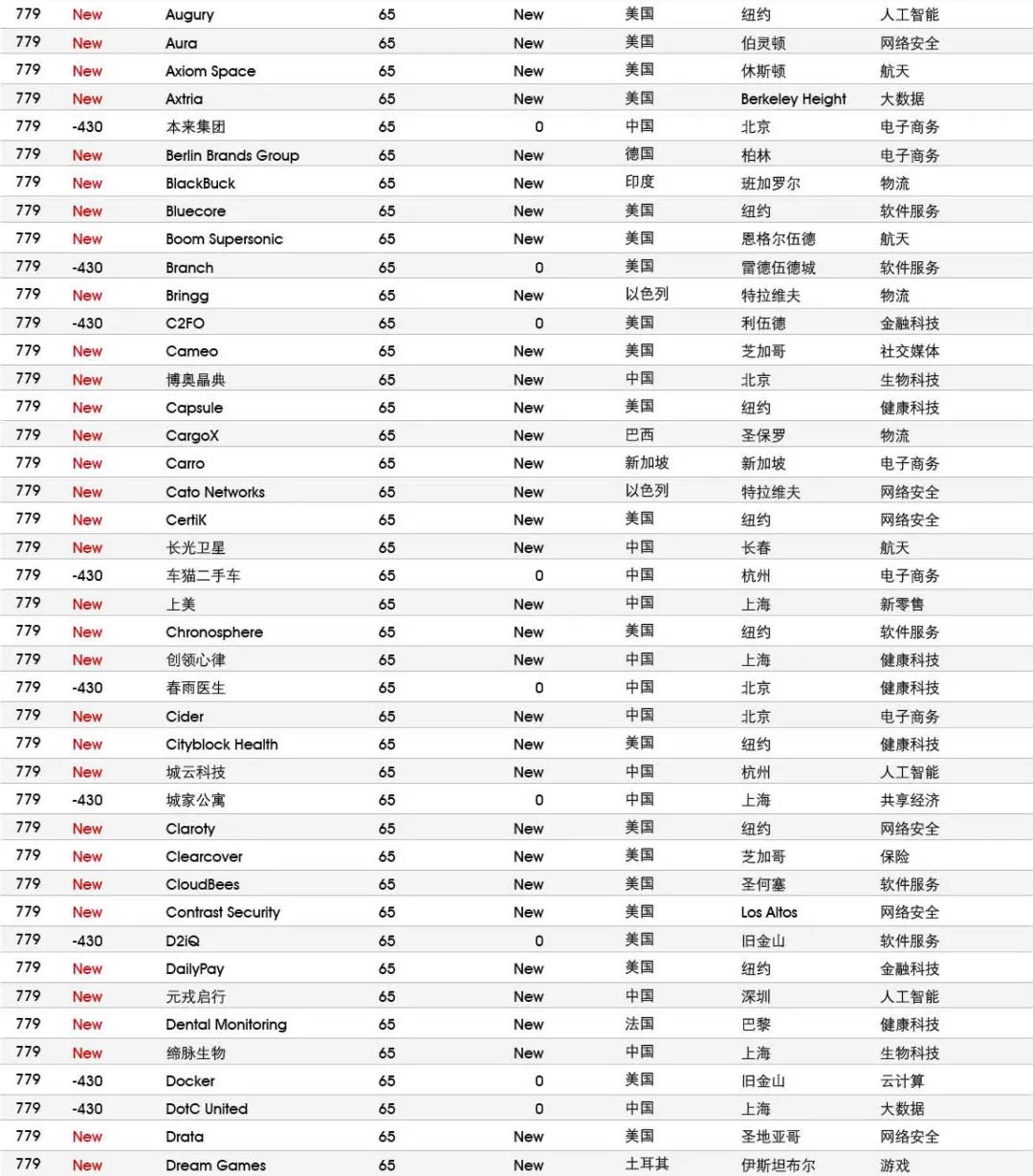 5家新进前十:总部斯德哥尔摩的支付平台Klarna、悉尼的在线设计平台Canva、旧金山的人工智能数据公司Databricks、旧金山的杂货配送平台Instacart和伦敦的数字银行Revolut。去年位列前十的滴滴、陆金所、爱彼迎、快手和Palantir因上市而退出榜单。