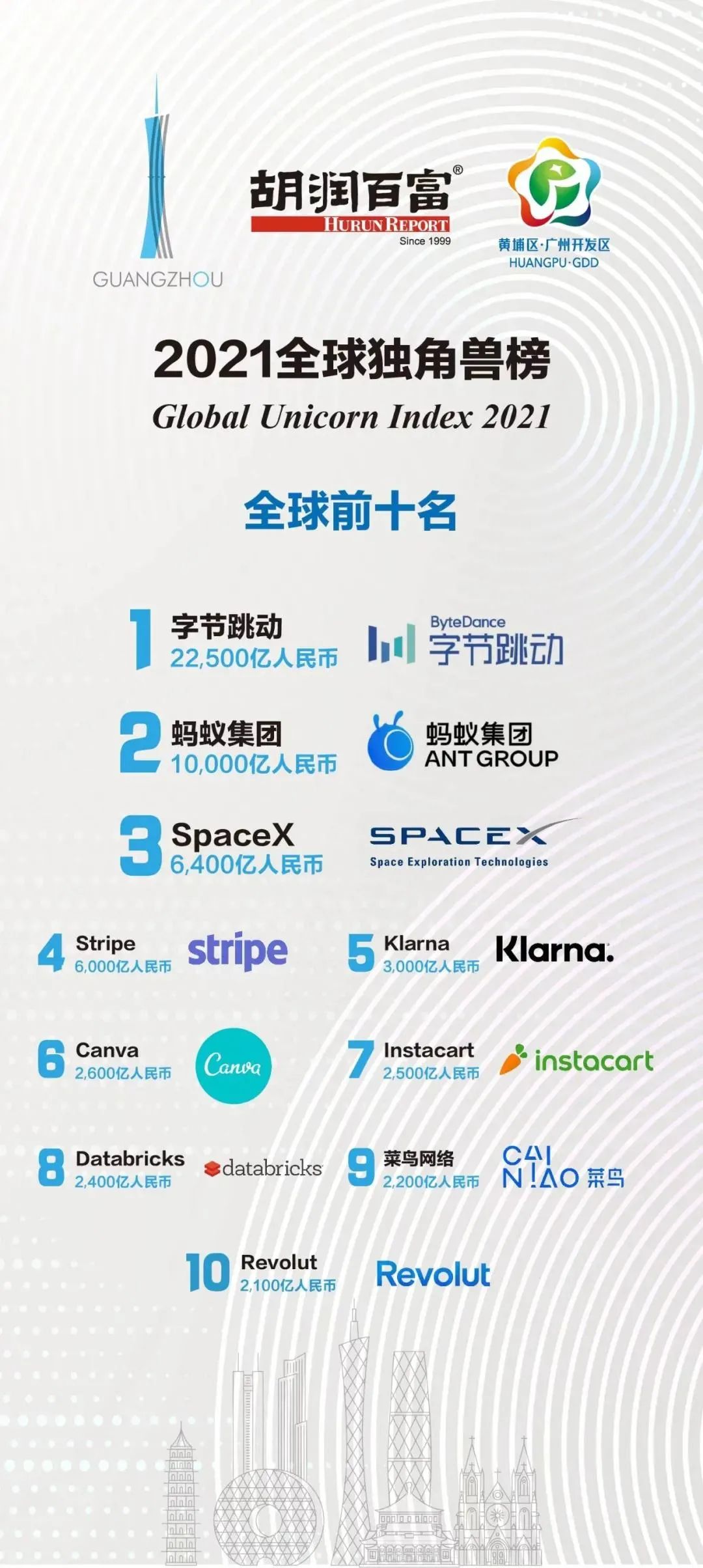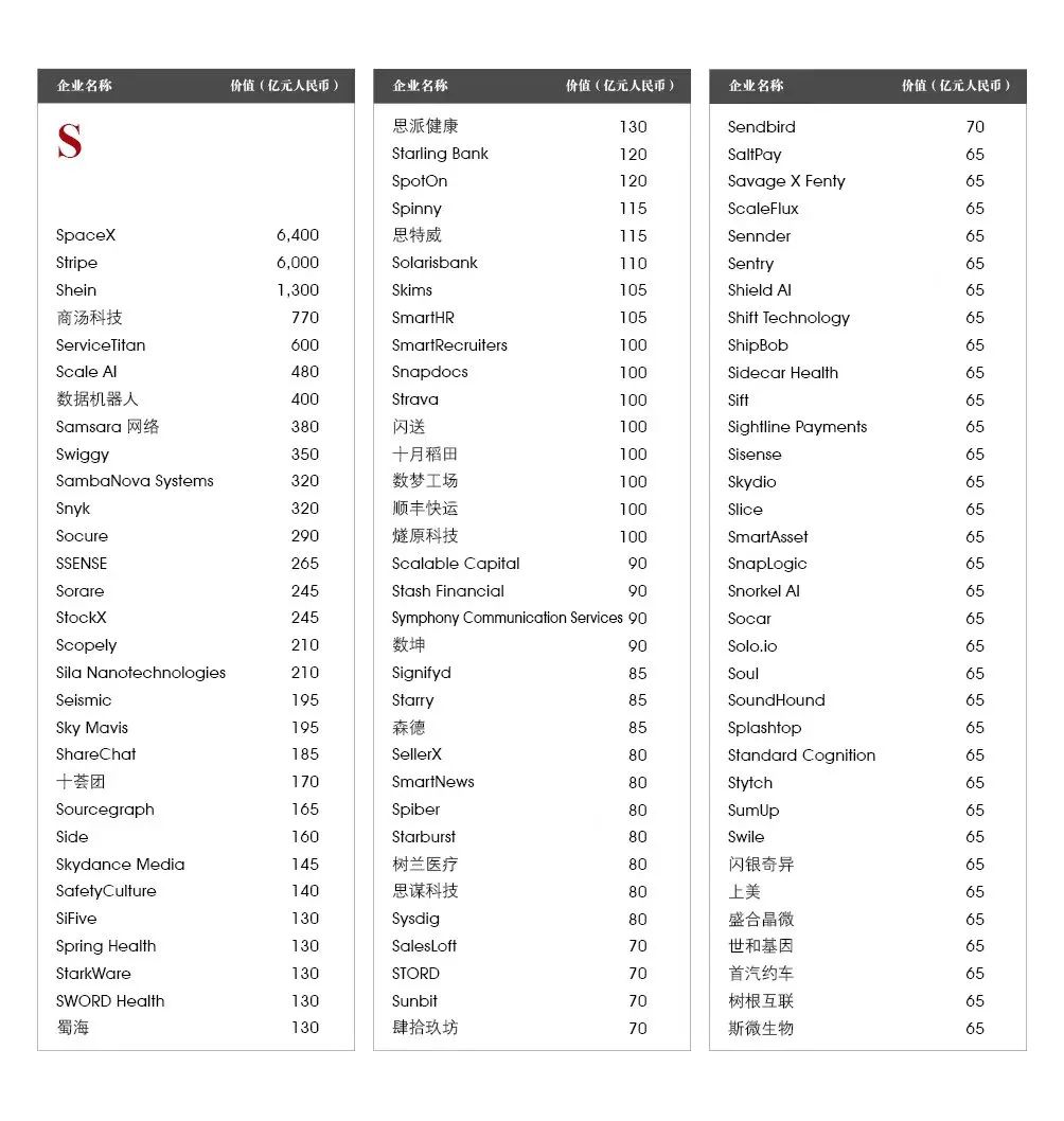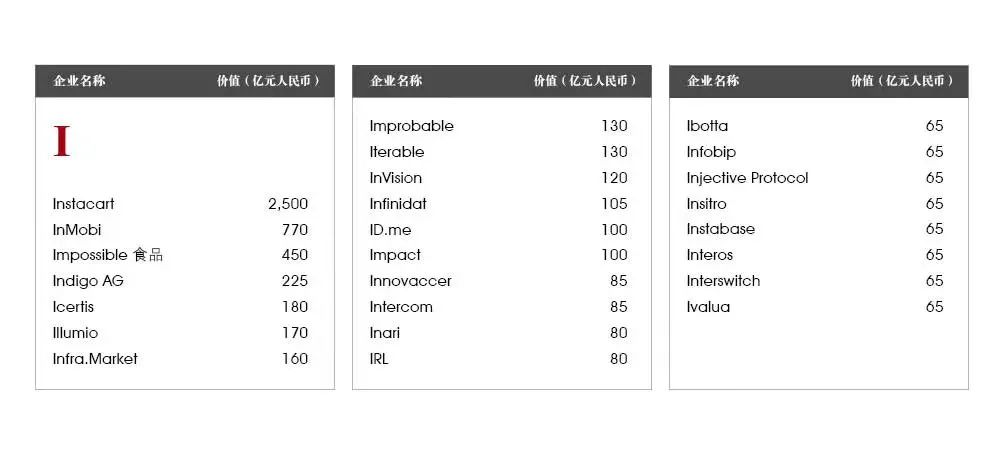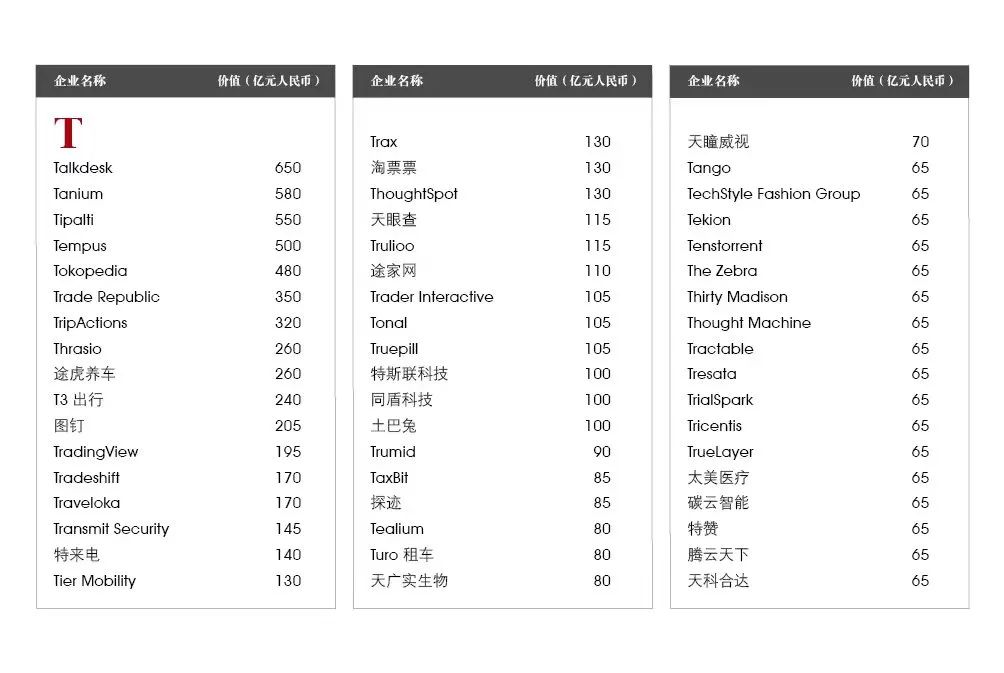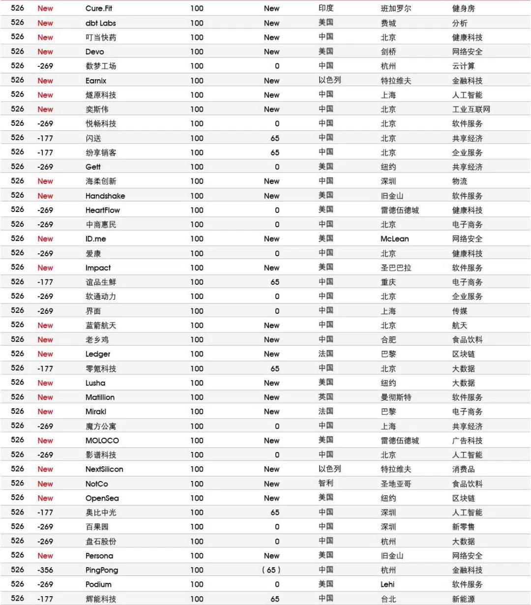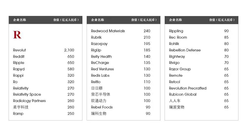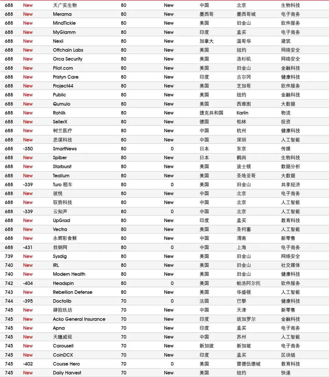 5家新进前十:总部斯德哥尔摩的支付平台Klarna、悉尼的在线设计平台Canva、旧金山的人工智能数据公司Databricks、旧金山的杂货配送平台Instacart和伦敦的数字银行Revolut。去年位列前十的滴滴、陆金所、爱彼迎、快手和Palantir因上市而退出榜单。