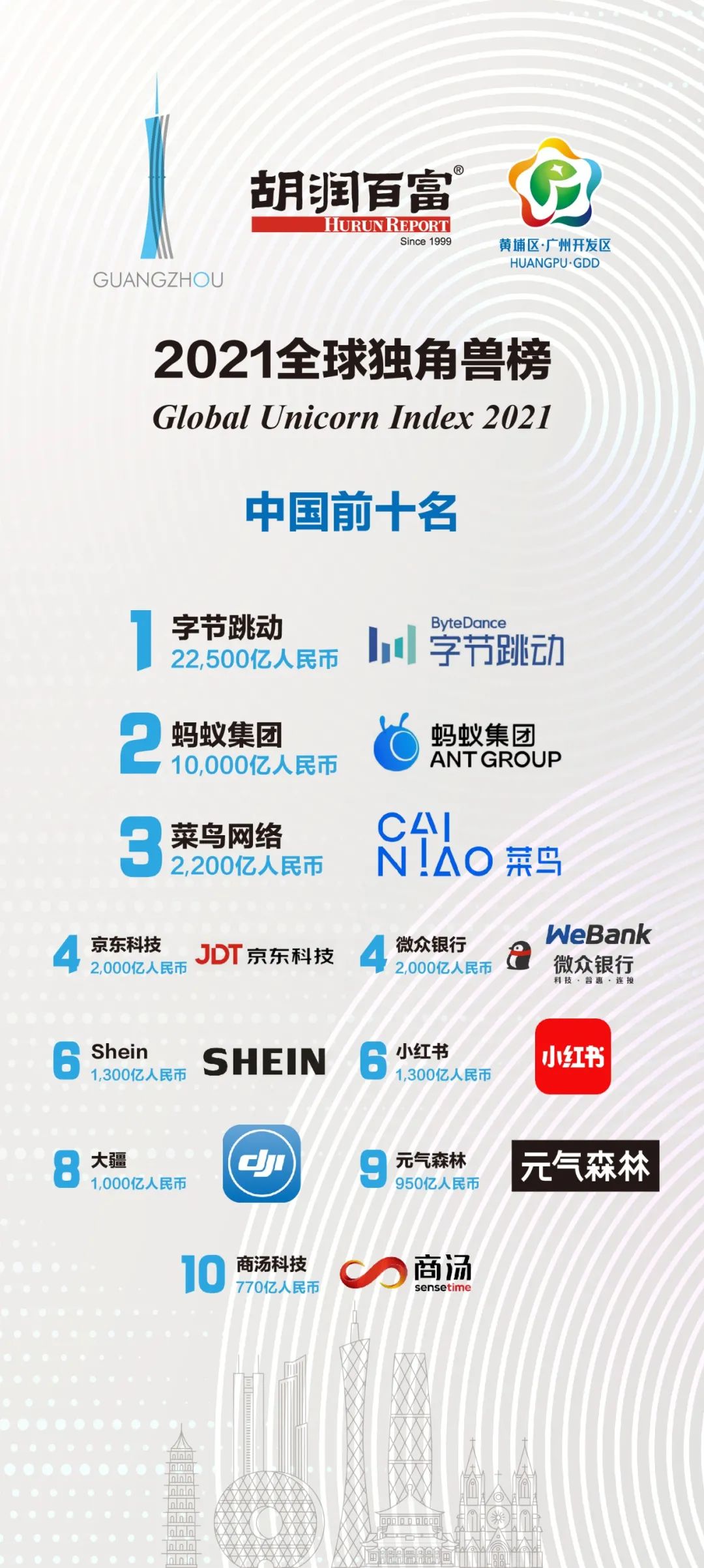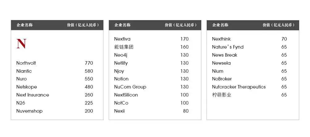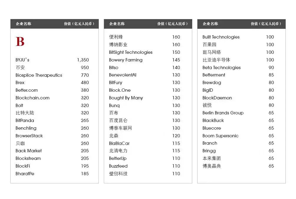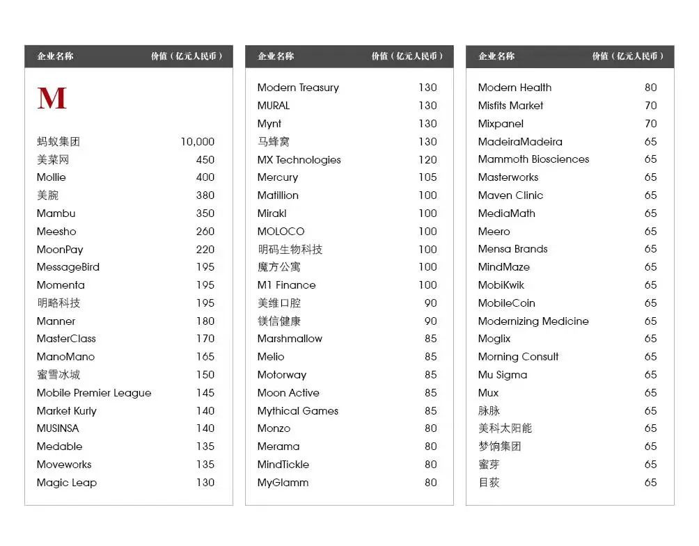 蚂蚁集团:总部杭州的蚂蚁集团以1万亿元估值排名第二。自去年上市失败以来,蚂蚁集团已将全球最大独角兽的头衔让给了字节跳动。在受到中国监管部门调查后,蚂蚁集团在重组其支付和贷款业务。