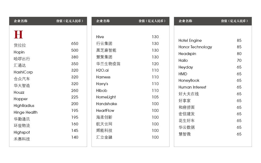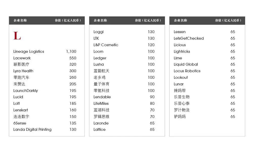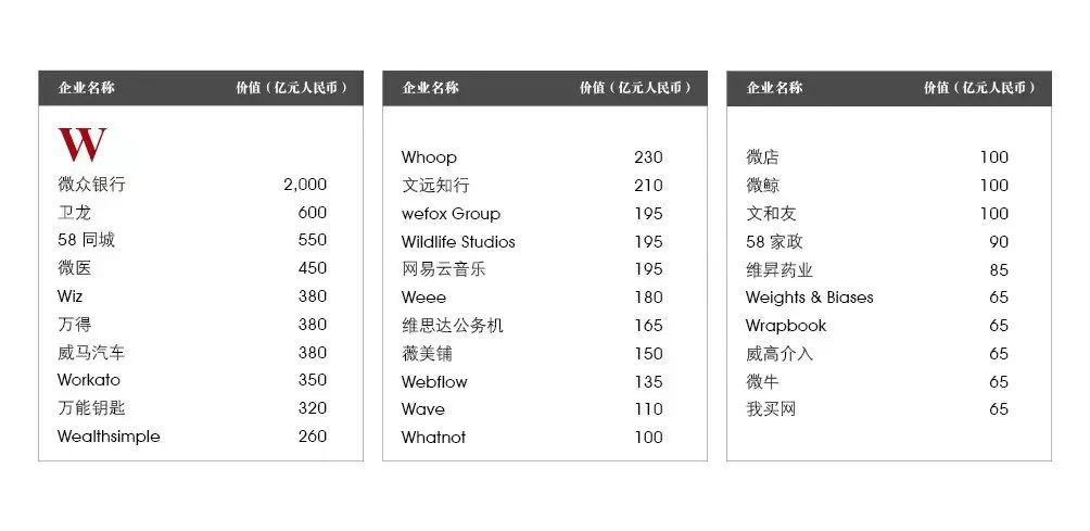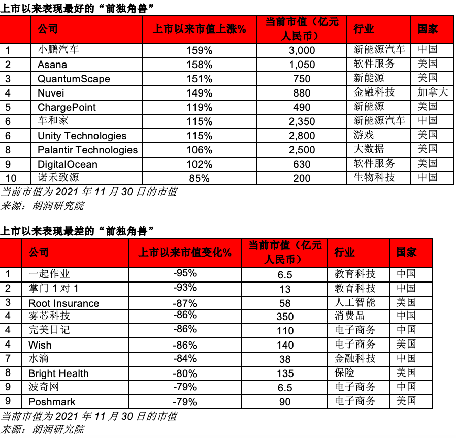 在“升级”的独角兽中,7家能够进入胡润世界500强,成为全球最具价值的500家公司之一,以总部旧金山的爱彼迎为首,其他还有云数据公司雪花算法、小鹏汽车、车和家(理想汽车)、虚拟货币交易平台Coinbase Global、游戏引擎Unity Technologies和数据分析公司Palantir Technologies。另外还有4家“升级”的中国独角兽能够进入胡润中国500强,它们是半导体企业格科微、Boss直聘、泡泡玛特和雾芯科技。