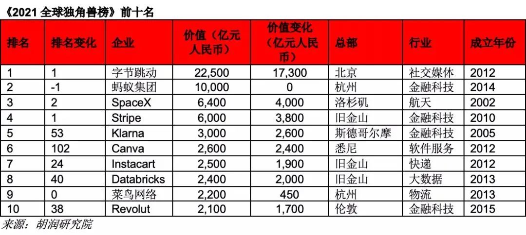 前十名占全球独角兽企业总价值的25%。4家来自美国,3家来自中国,澳大利亚、英国和瑞典各1家。