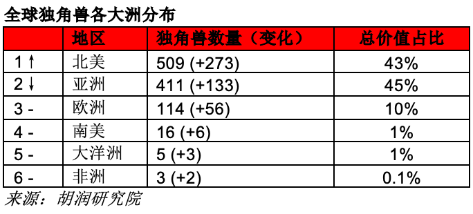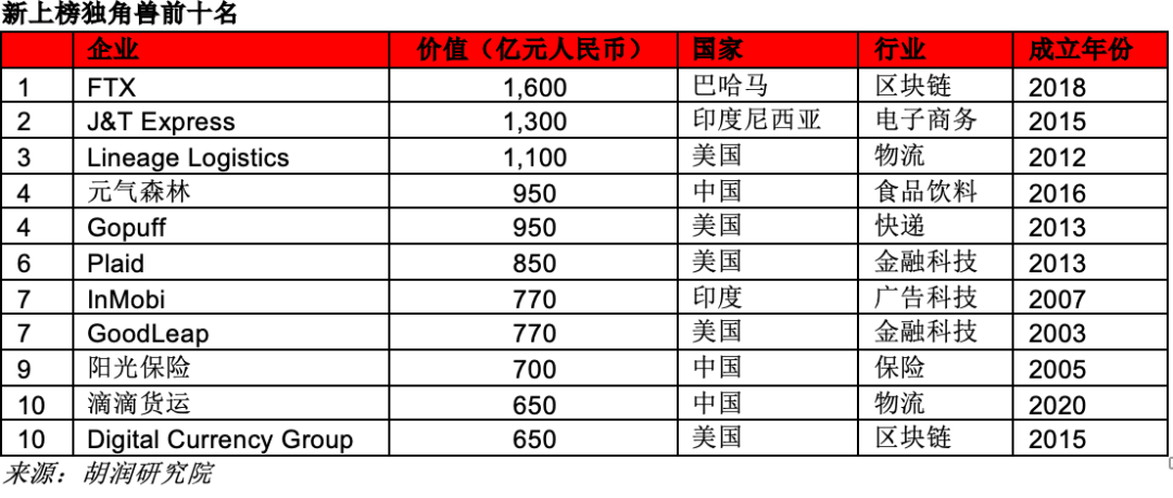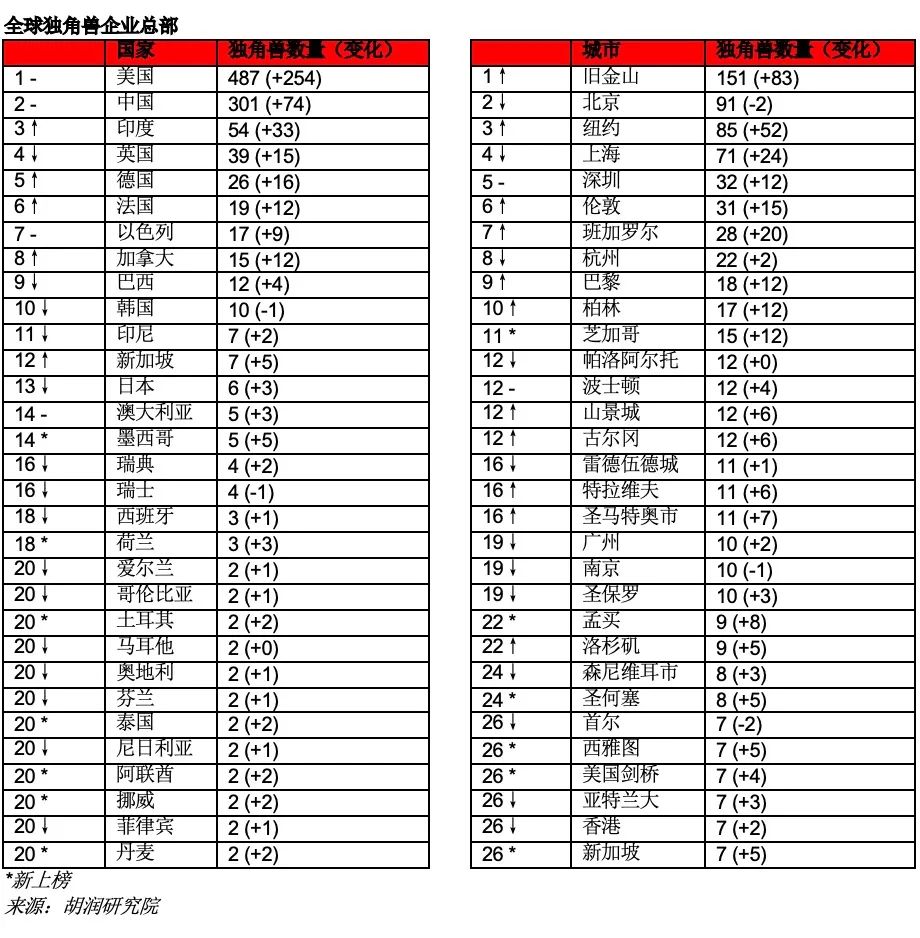胡润研究院在38个国家发现了673家新独角兽企业。美国新上榜347家,其次是中国146家,印度41家。新上榜独角兽的总价值9万亿元,相当于俄罗斯的GDP。