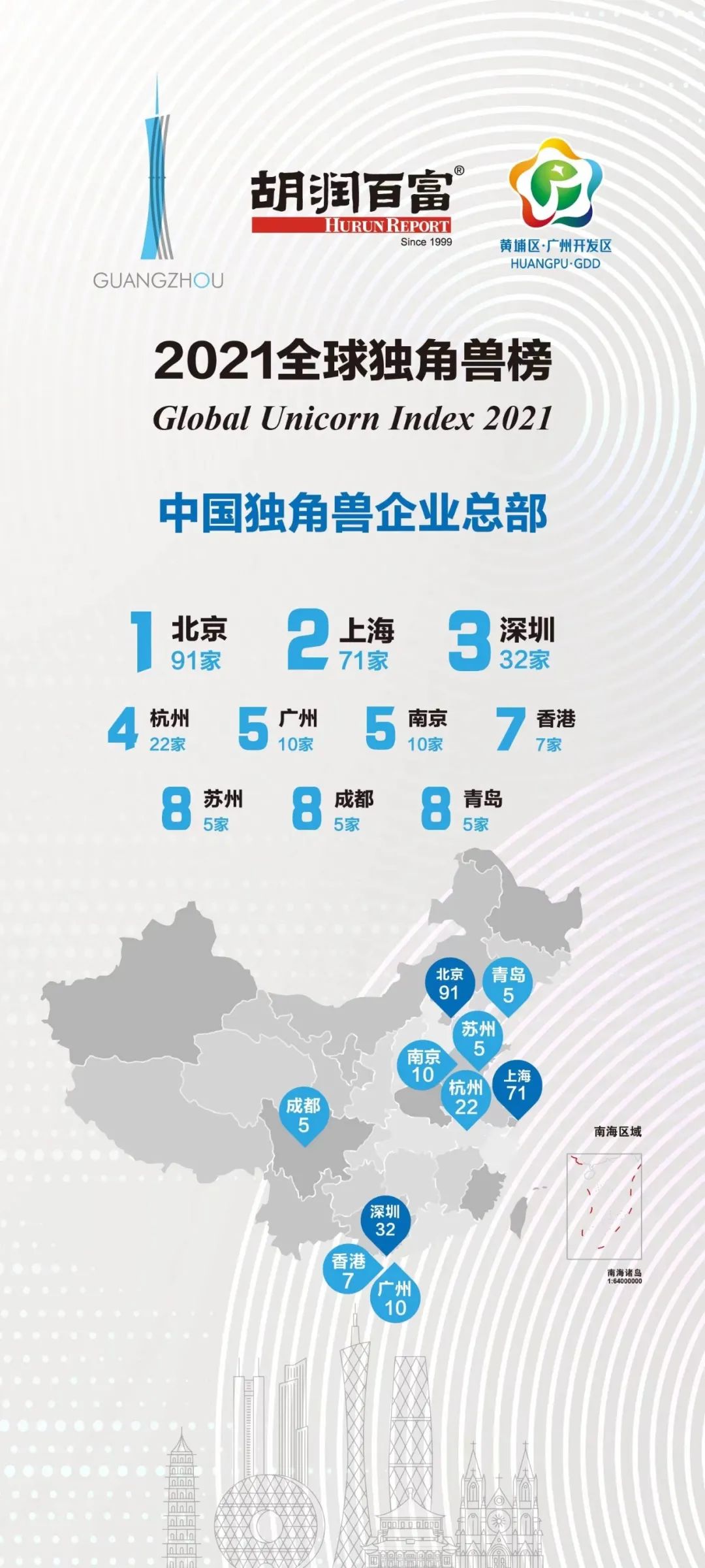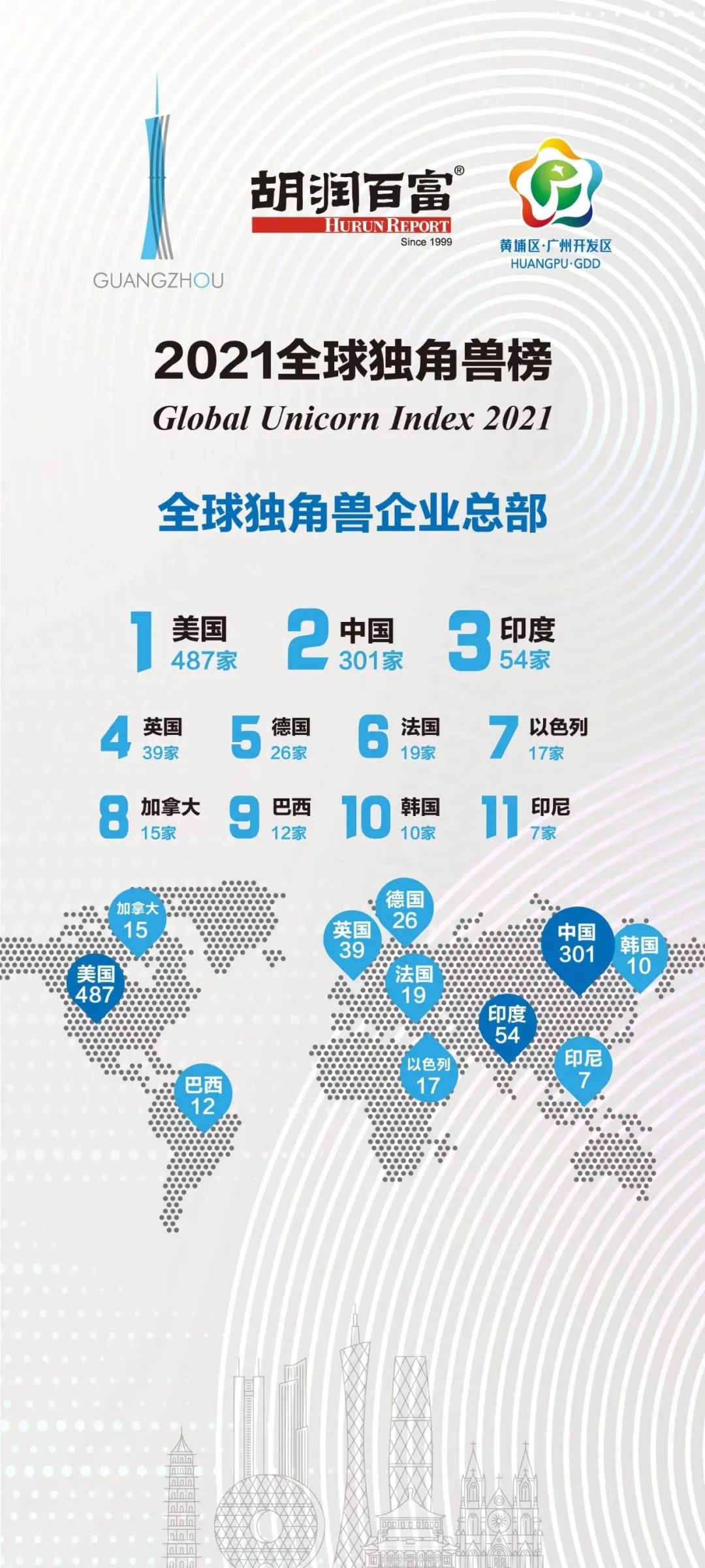 全球独角兽企业分布在42个国家(去年29个),221个城市(去年145个)。
