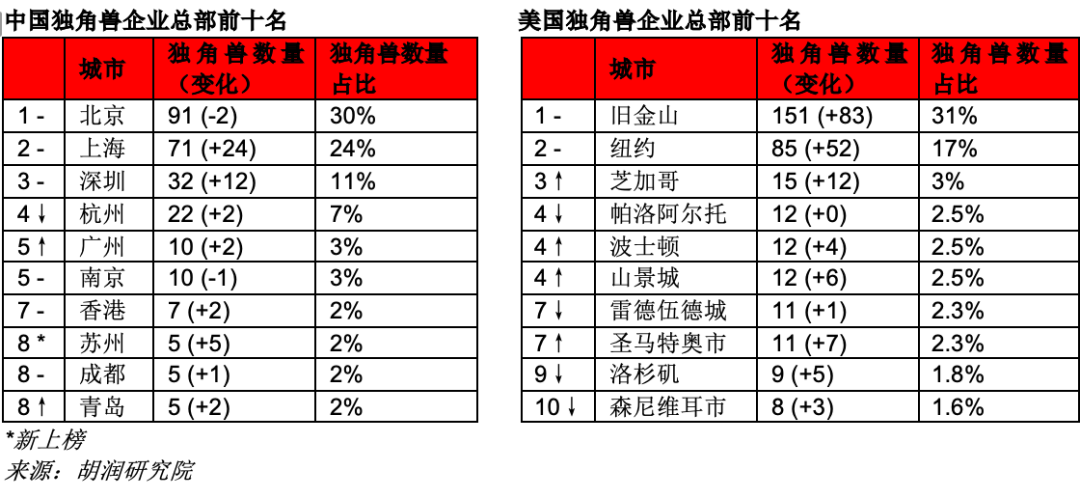 美国今年新上榜347家,中国新上榜146家。美国下榜94家,其中89家“升级”了(75家上市,14家被并购),5家估值跌破10亿美元而退出榜单。中国下榜72家,其中41家“升级”了(38家上市,3家被并购),31家估值跌破10亿美元而退出榜单。