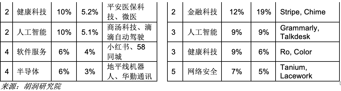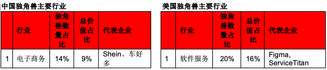 从行业来看,前五大行业都占独角兽数量的一半,美国的独角兽公司以软件服务和金融科技行业居多,而中国的独角兽公司则以电子商务和健康科技行业居多。