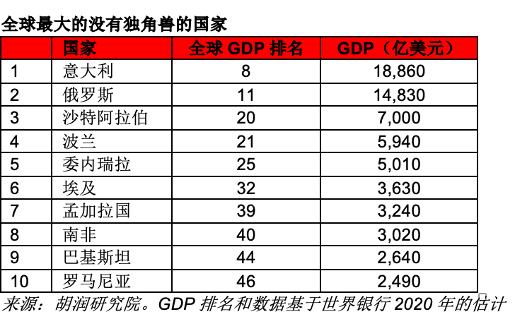 意大利是全球GDP排名前十的国家中,唯一一个没有独角兽的国家。