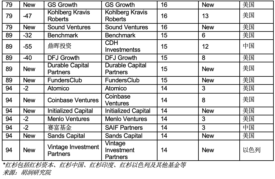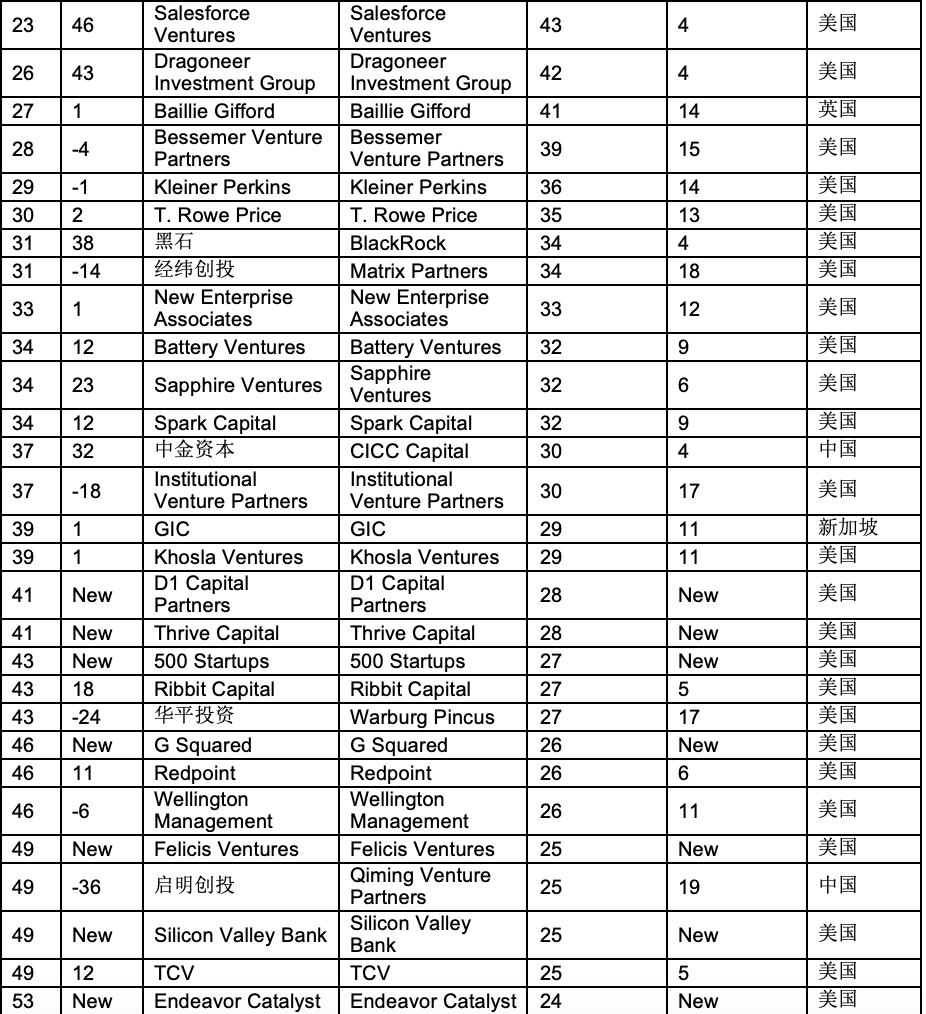 红杉仍然是全球最成功的独角兽投资机构。老虎基金超过软银,位列第二。“三大投资机构”共投资了上榜独角兽企业中的50%。Insight Partners和Coatue首次进入前十,取代了IDG和阿里巴巴。