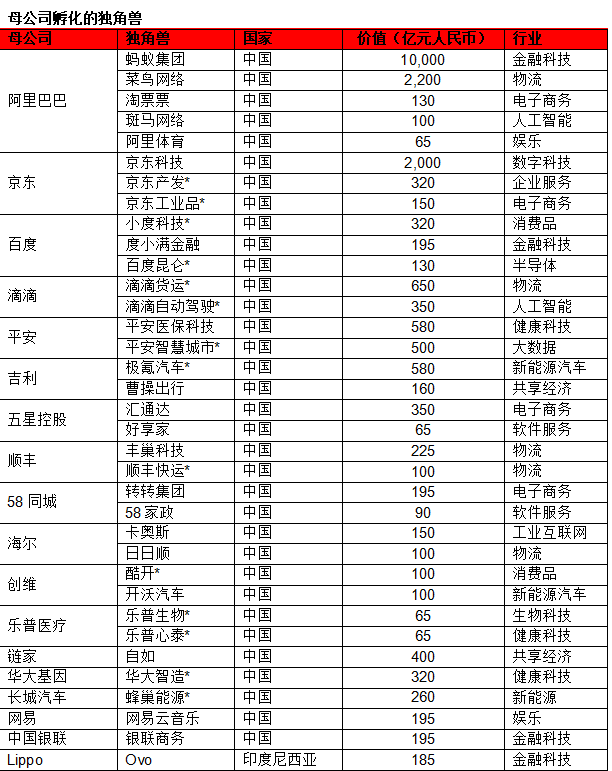 附录2:母公司孵化的独角兽